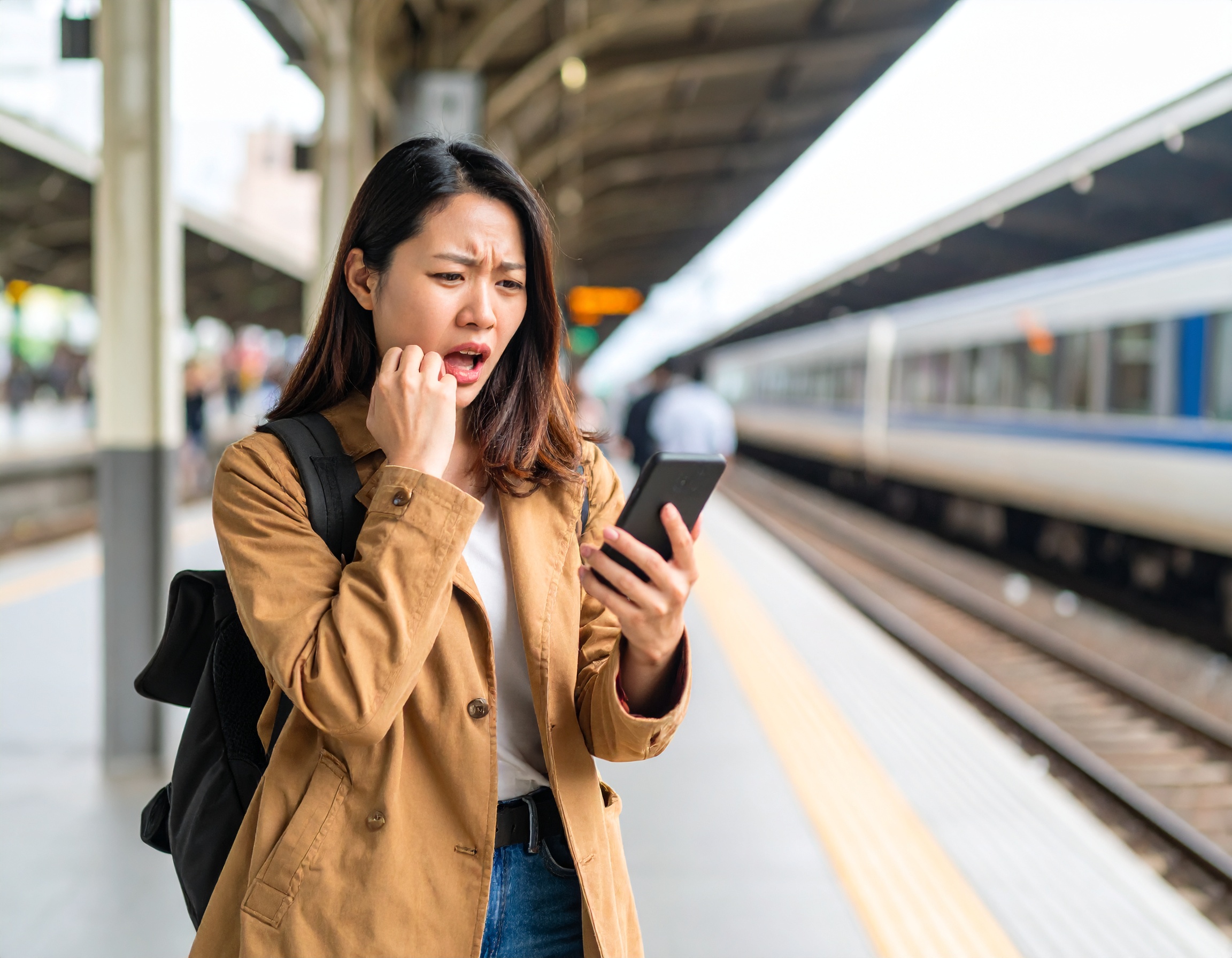 電車のホームでスマートフォンを見つめ、驚きや不安の表情を浮かべる女性の姿を捉えた一枚です。遅延情報、予期せぬトラブル、急な連絡などをイメージさせるシーンに利用できます。