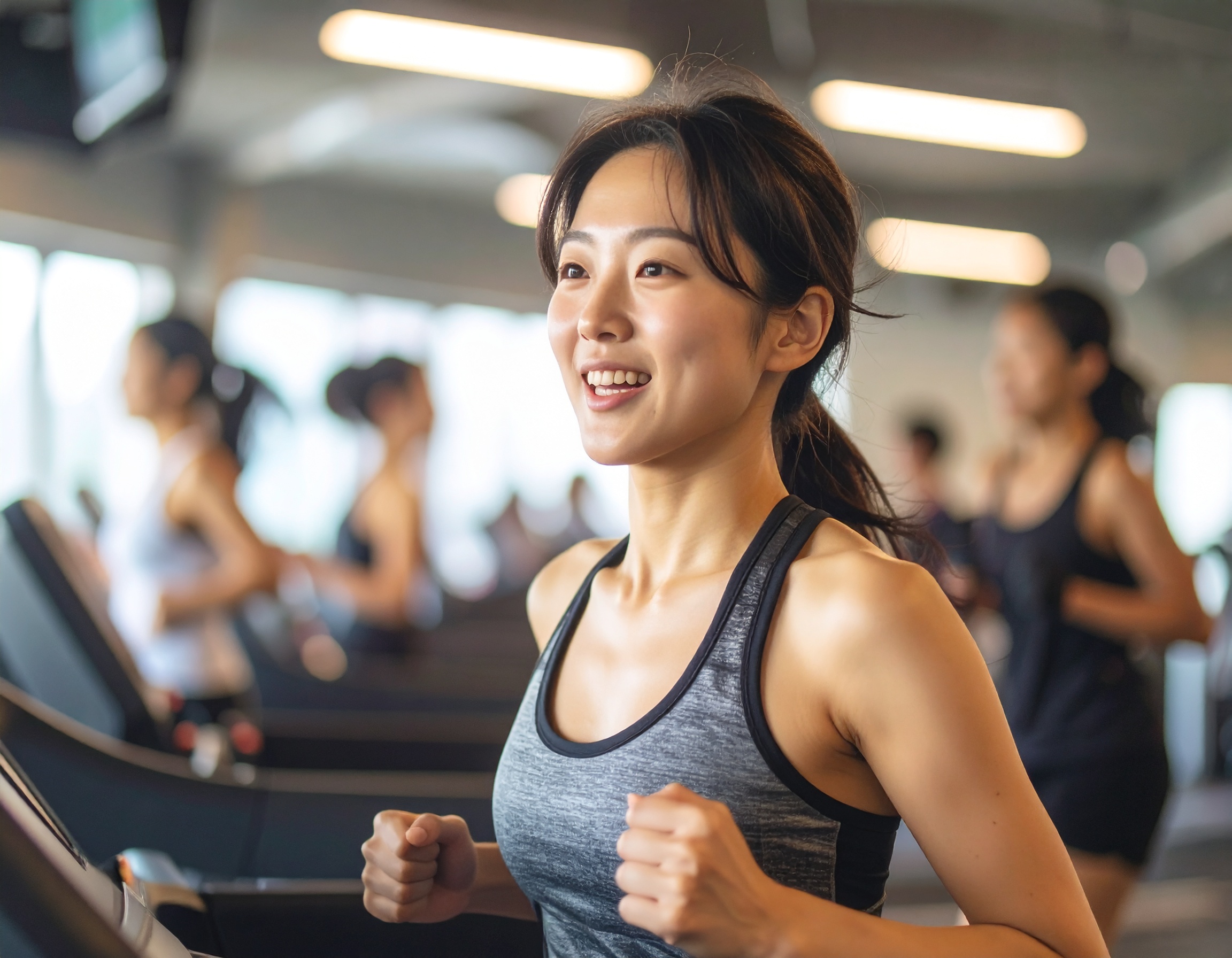 フィットネスクラブでランニングマシンを使い、爽やかな笑顔でトレーニングする女性の姿を捉えた一枚です。健康的で前向きな雰囲気が伝わり、運動やライフスタイルに関するシーンに活用しやすい素材です。