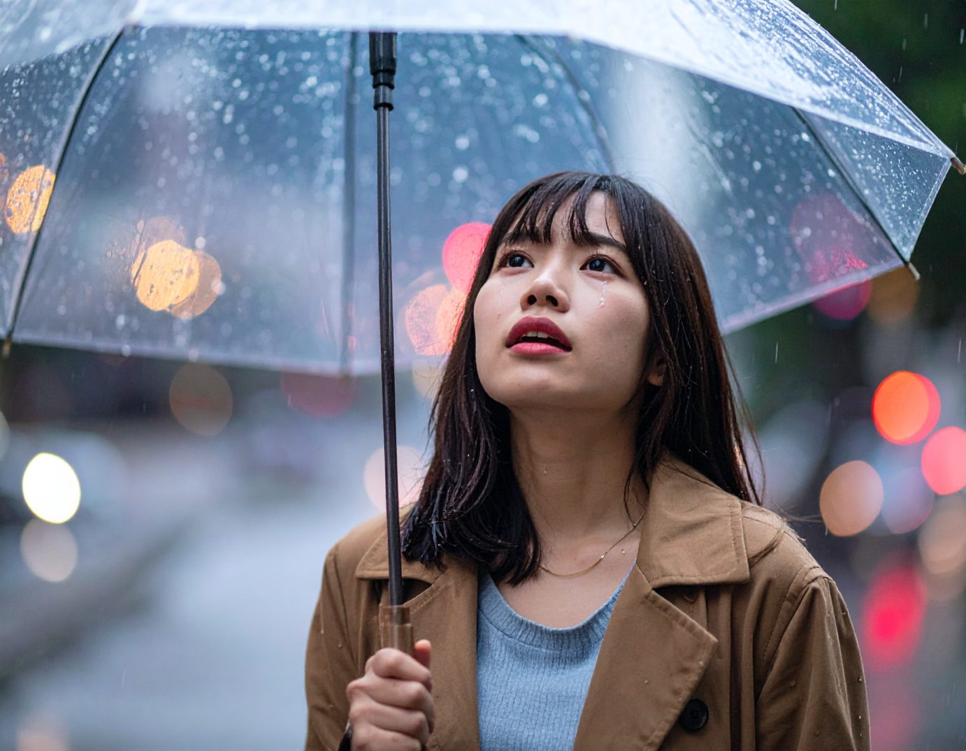 雨の中、透明な傘を差しながら空を見上げる女性の表情を切り取った一枚。街のライトがぼんやりと滲み、切なさや物思いを感じさせる雰囲気を演出しています。孤独や希望、心の揺れ動きを表現する素材として活用できます。