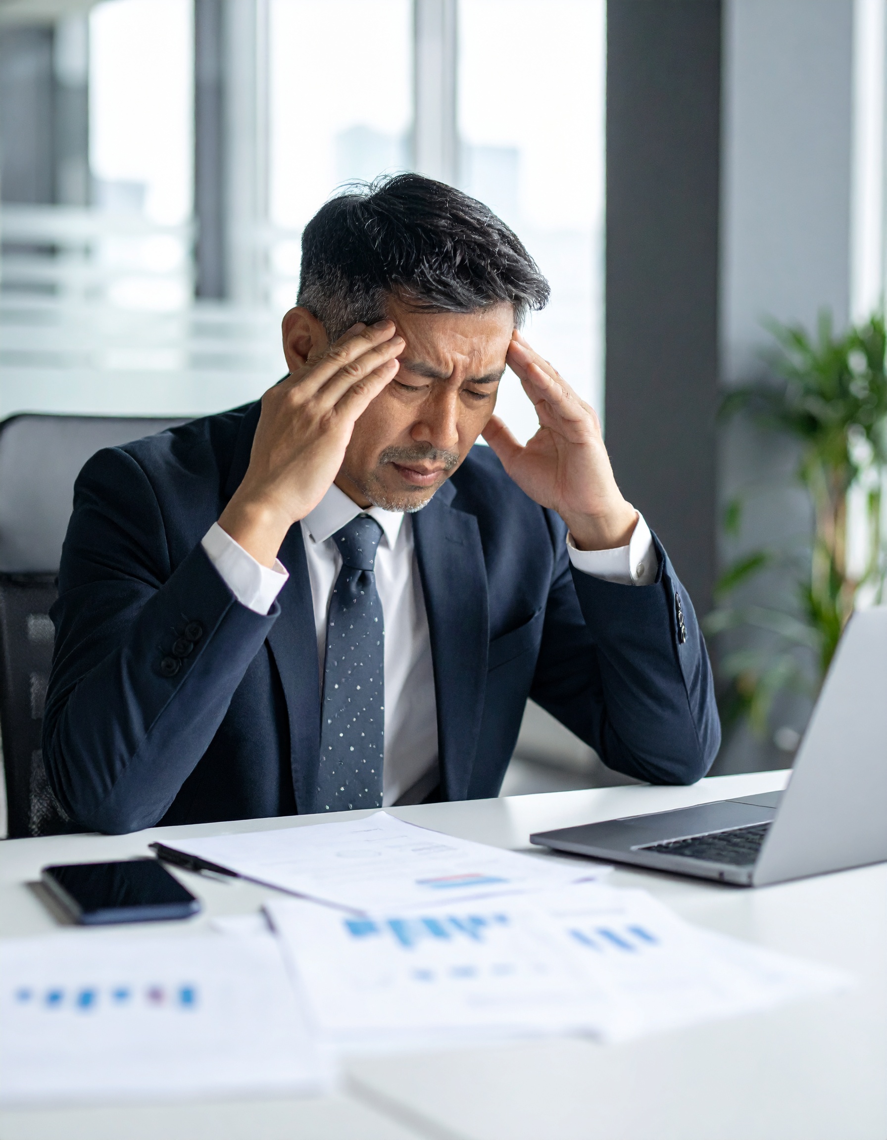 頭を抱えるビジネスマン:仕事のトラブルに苦悩する瞬間