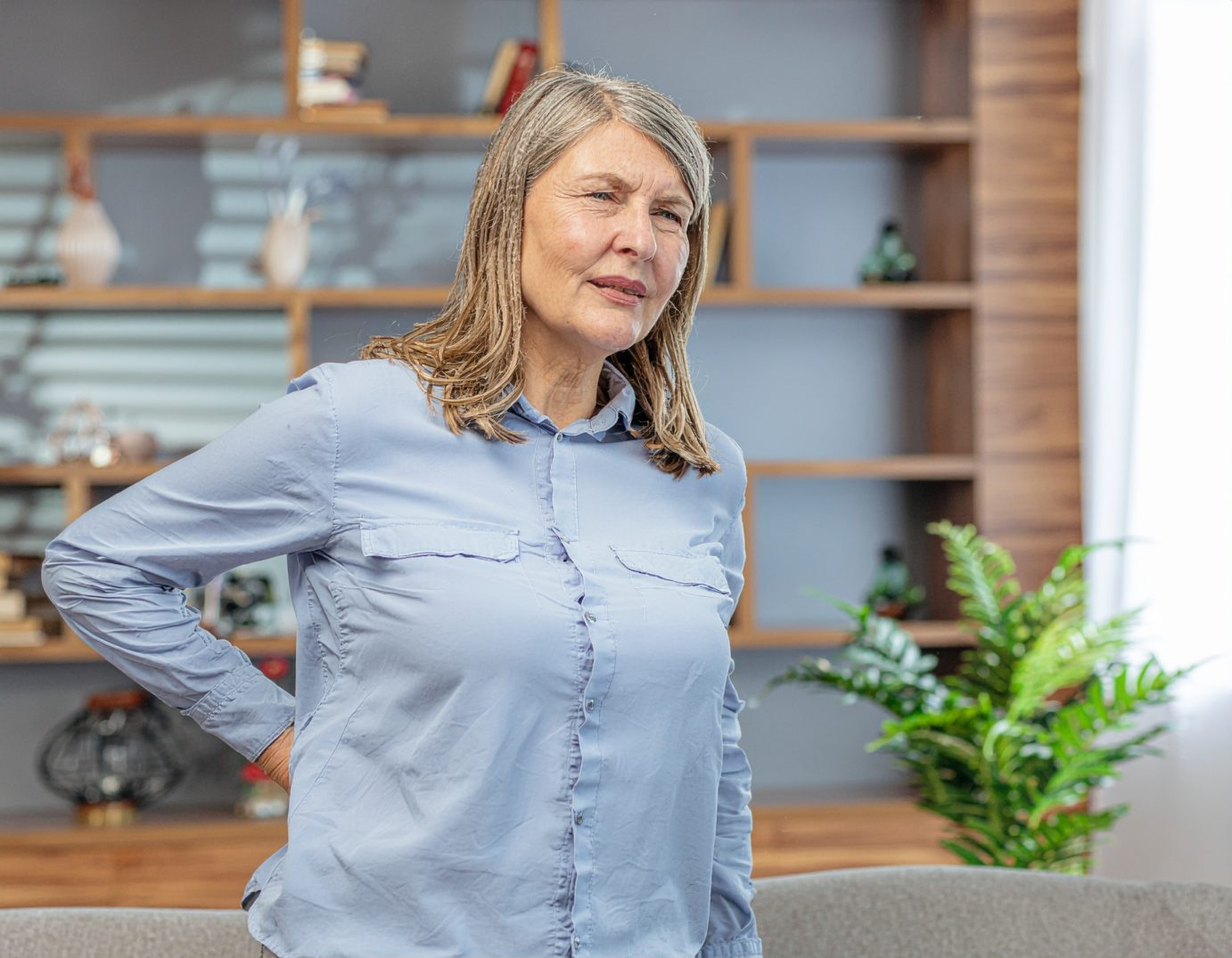 腰の痛みに耐える女性:慢性的な疲労と痛みの表情