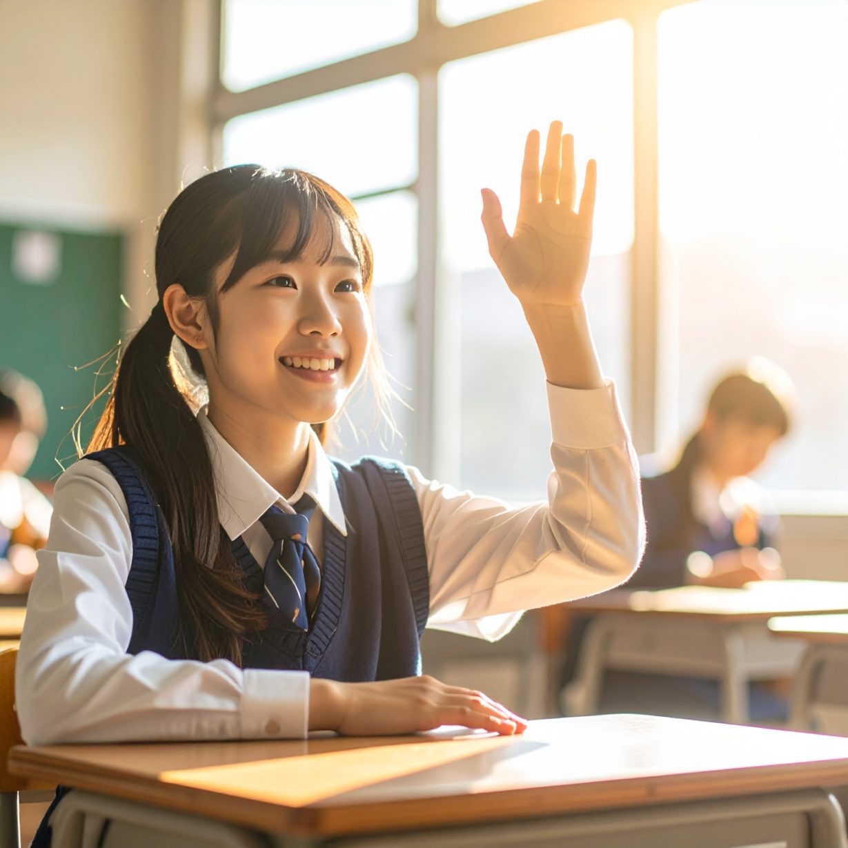 教室で手を挙げ、笑顔で発言する女子学生を描いたAI生成イメージです。積極的に学ぶ姿勢や、明るく前向きな雰囲気を柔らかな光とともに表現しています。教育、学習意欲、学校生活、自己成長などのテーマにぴったりの素材です。