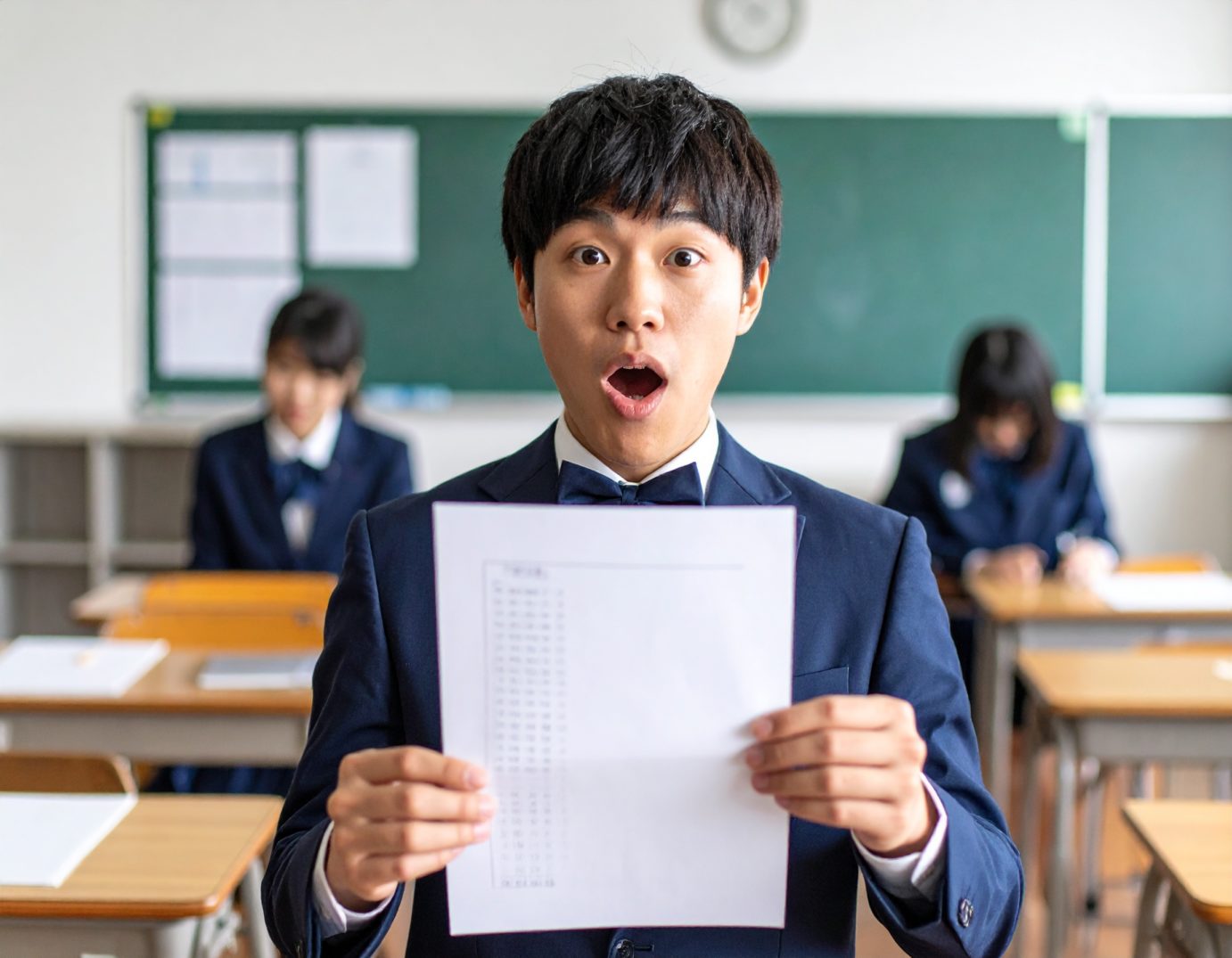 テスト用紙を手に、思わず驚いた表情を見せる男子学生を描いたAI生成イメージです。意外な結果やサプライズな出来事をリアルに表現。教育・受験・学校生活・成績発表などのシーンにぴったりの素材です。記事や広告、SNS投稿にも活用できます。