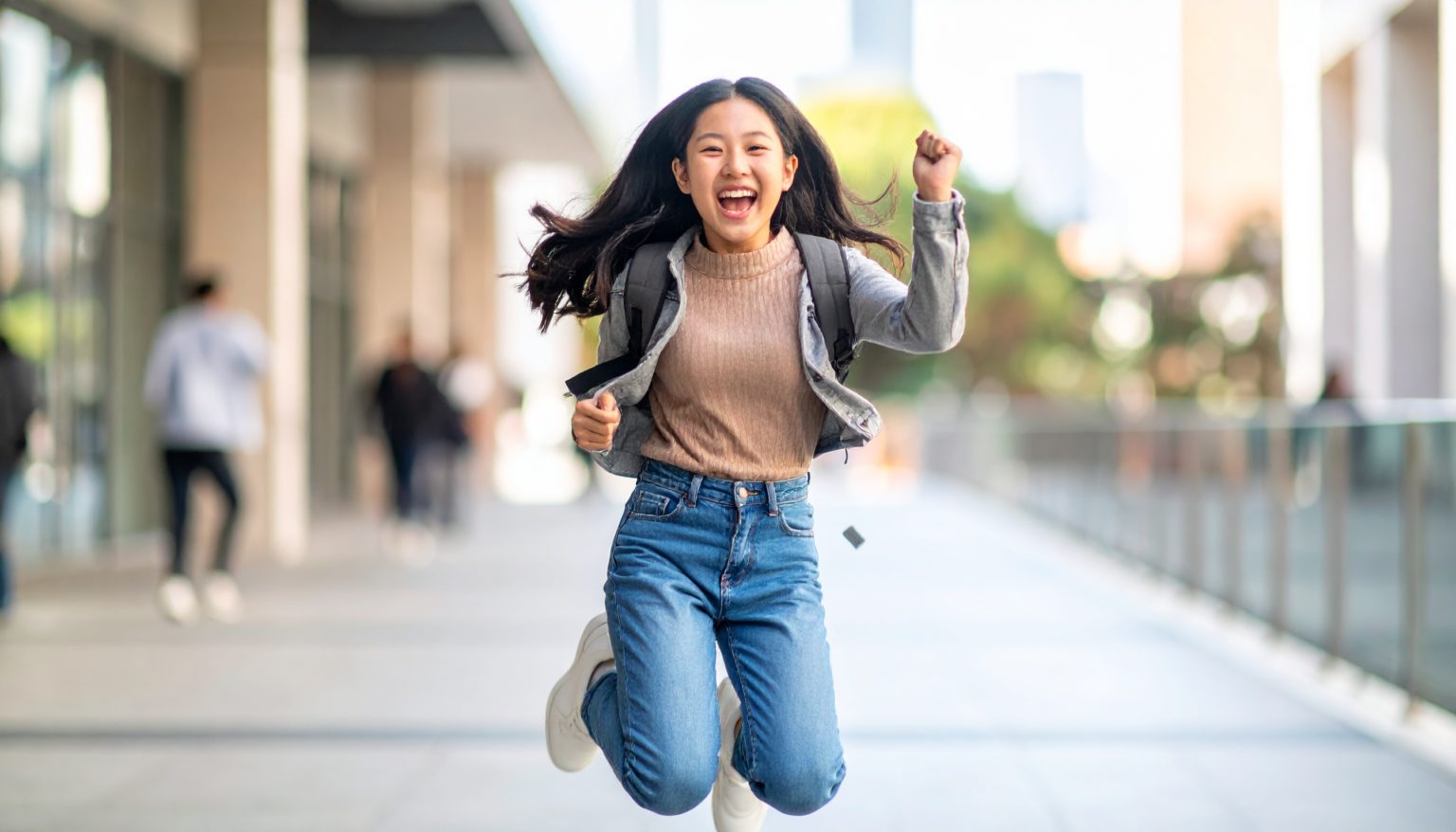 街中で飛び跳ねるように喜ぶ女性を描いたAI生成イメージです。嬉しさや達成感、希望に満ちた瞬間を爽やかに表現しています。ポジティブな気持ちや新しいスタート、成功、成長、学生生活などをテーマにした記事や広告素材にぴったりです。
