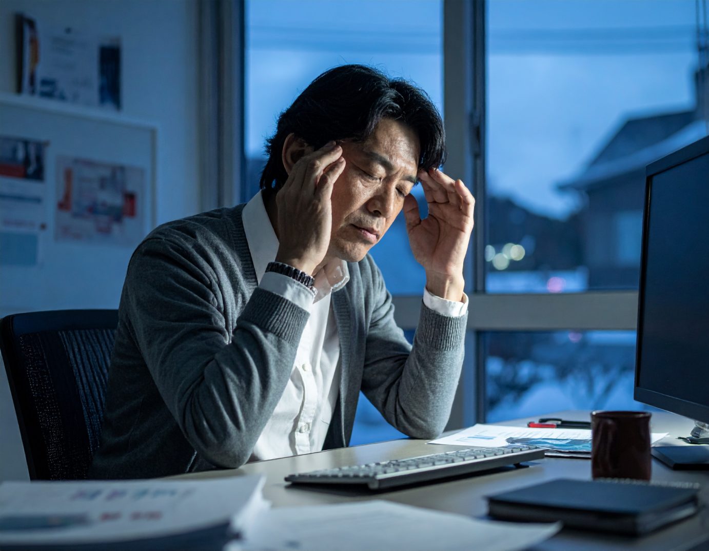 残業中に頭を抱える男性の姿を描いた感情的なポートレート。仕事のプレッシャーやストレス、疲労感をリアルに表現した画像です。ビジネスやメンタルヘルス関連のテーマに最適。