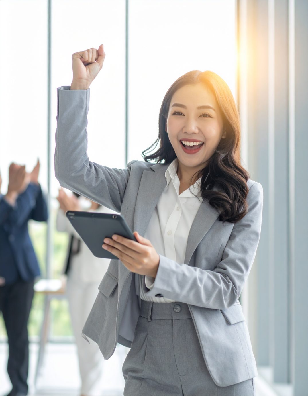 オフィスでタブレットを手に、成果を喜ぶ女性ビジネスパーソンを描いたAI生成イメージです。努力が実を結んだ瞬間の笑顔や達成感をリアルに表現しています。プレゼン成功、プロジェクト達成、チームワーク、ポジティブな職場文化などをテーマにした記事や広告素材にぴったりです。