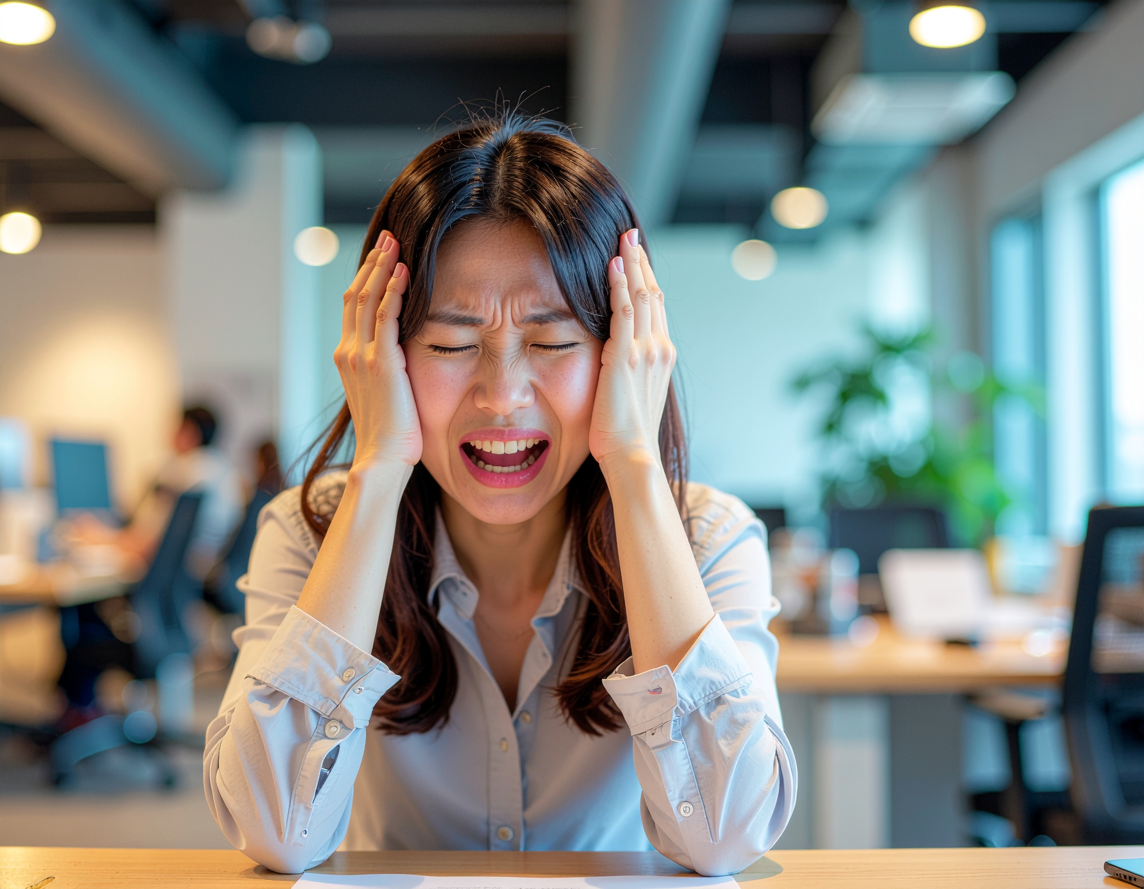 仕事のストレスで限界!オフィスで頭を抱える女性の感情表現イメージ