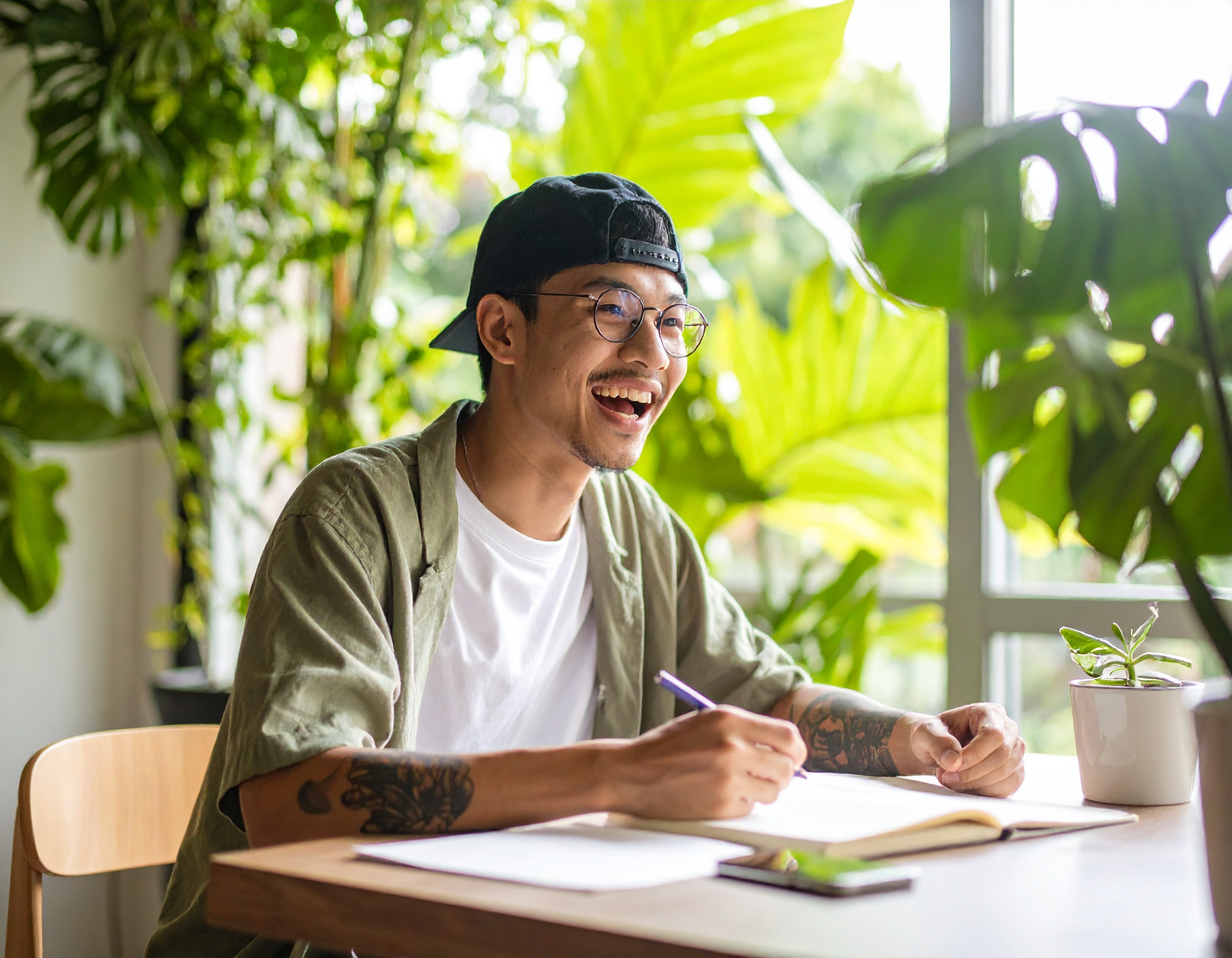 楽しいカジュアルな服装にキャップをかぶった若手デザイナーが、明るい空間でスケッチをしながら楽しそうに笑顔を見せているシーンです。自然光とグリーンに囲まれた雰囲気は、自由な発想や創造性を象徴します。クリエイティブな仕事やリモートワークのポジティブなイメージを表現する素材として最適です。