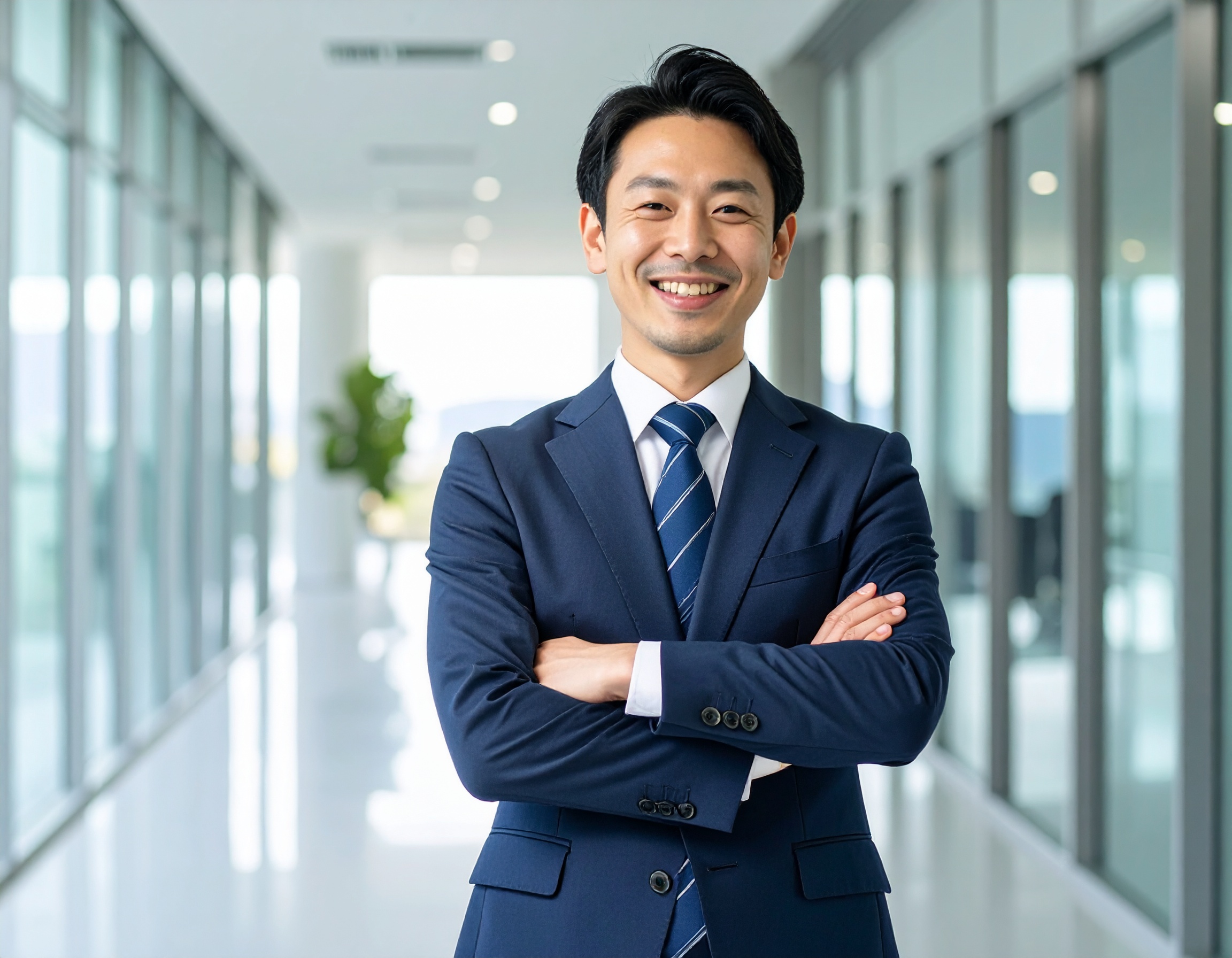 明るいオフィスの廊下で腕を組み、自信あふれる笑顔を見せる男性のポートレート。ネイビースーツと落ち着いた雰囲気が、信頼感やプロフェッショナルさを強調しています。企業サイトやビジネス関連のコンテンツ、採用広告など幅広く活用できる素材です。