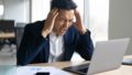 ノートパソコンに向かいながら頭を押さえ、険しい表情を浮かべるスーツ姿の女性。カフェの静かな空間にもかかわらず、心の中には焦りやストレスが渦巻いている様子が伝わってきます。仕事の行き詰まりや情報過多、在宅勤務やフリーランスの孤独感など、現代社会のストレスをリアルに表現した素材です。