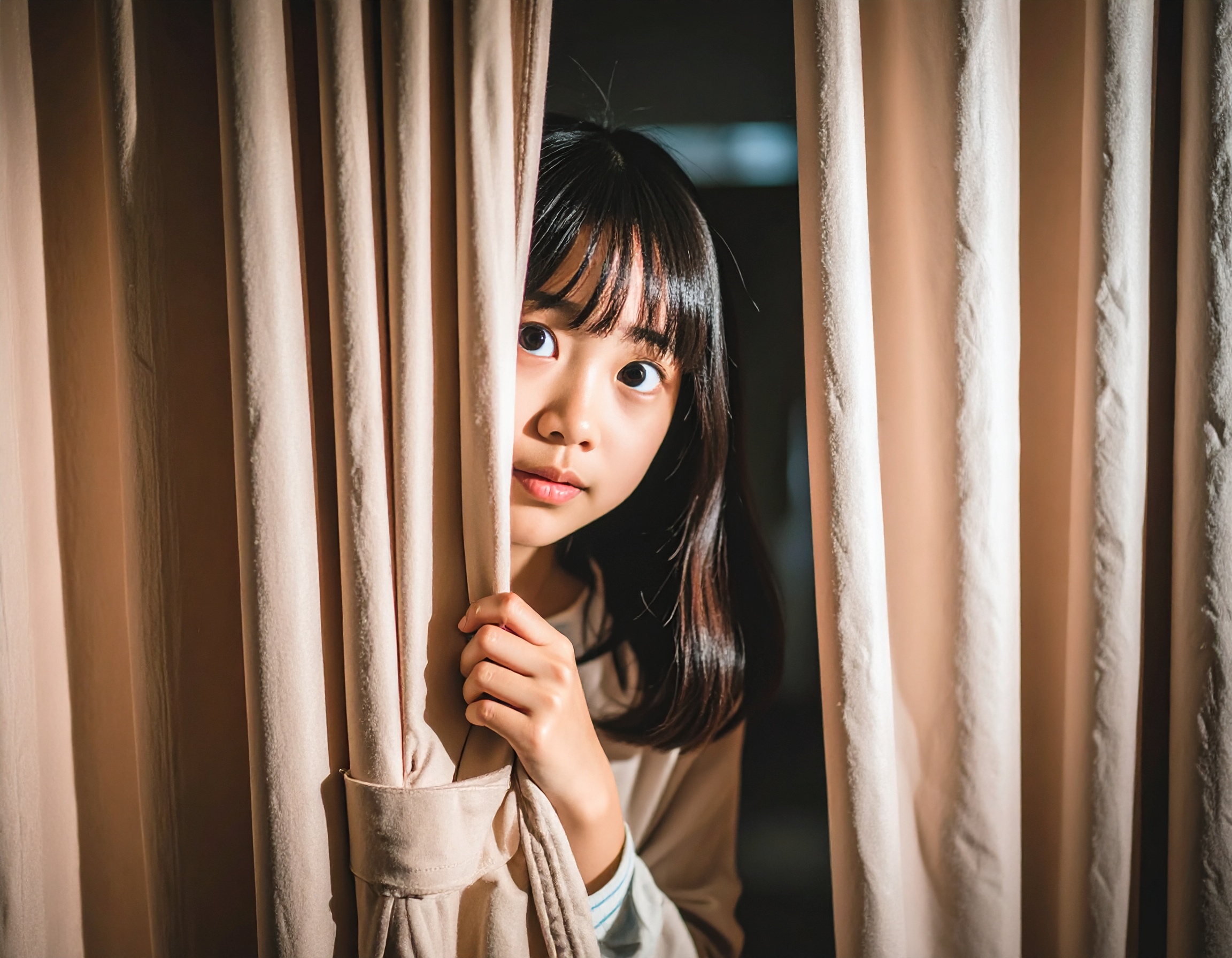 カーテンの隙間から不安そうにこちらを見つめる少女の姿を捉えたAI生成画像です。警戒心や恐怖心、緊張、戸惑いなど、繊細で複雑な感情を表情と構図で表現しています。子どもにまつわる心理的なシーンや、ストーリー性のある場面作りに適した素材としてご利用いただけます。画像は商用・非商用問わず、無料でご利用可能です。