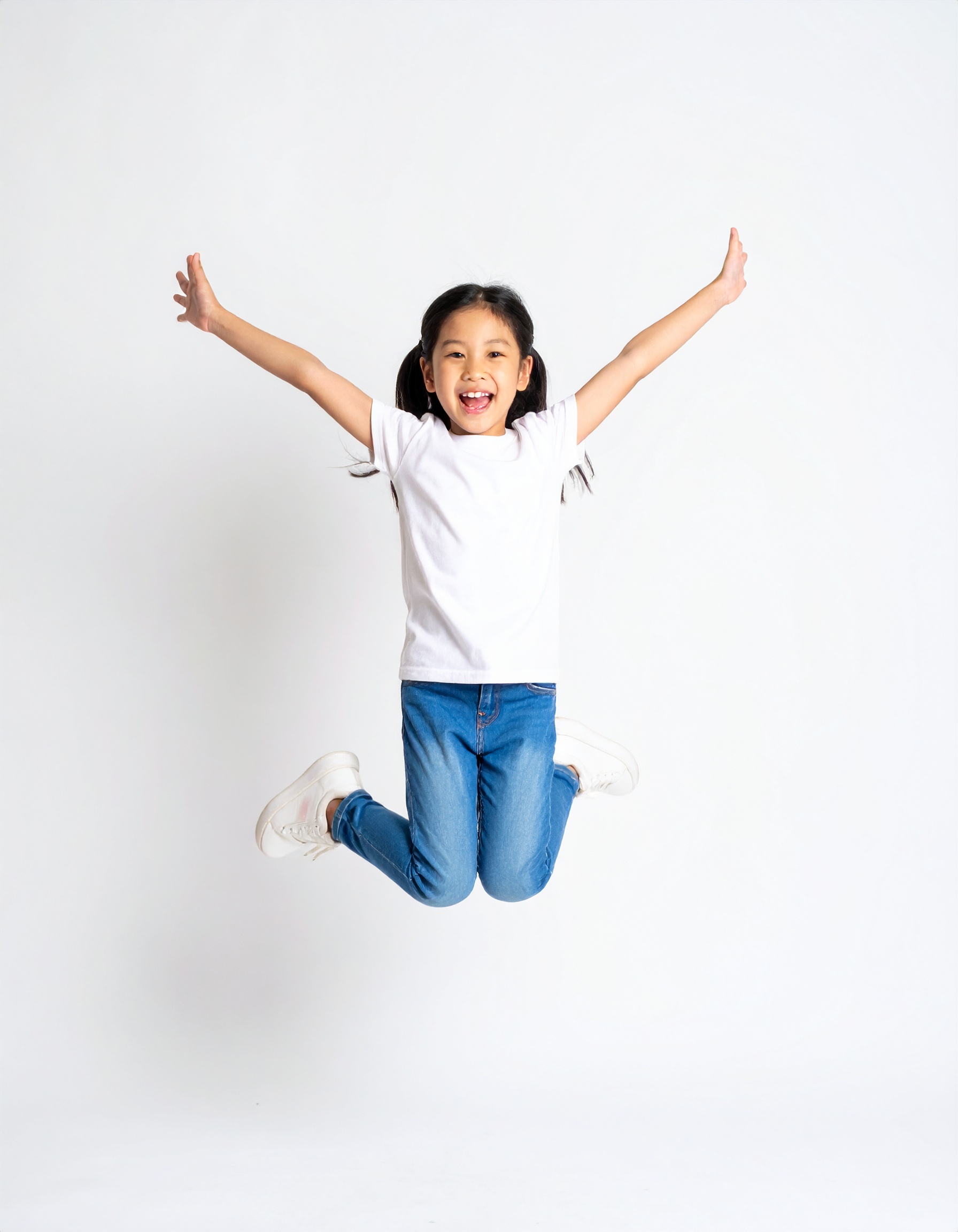 純粋な喜びを全身で表現する日本人の少女が、勢いよくジャンプしている様子をとらえた画像です。両手を大きく広げたポーズと笑顔が印象的で、明るくポジティブな感情を伝えたい場面にぴったりの素材です。背景はシンプルな白で、汎用性の高いデザインに仕上がっています。
