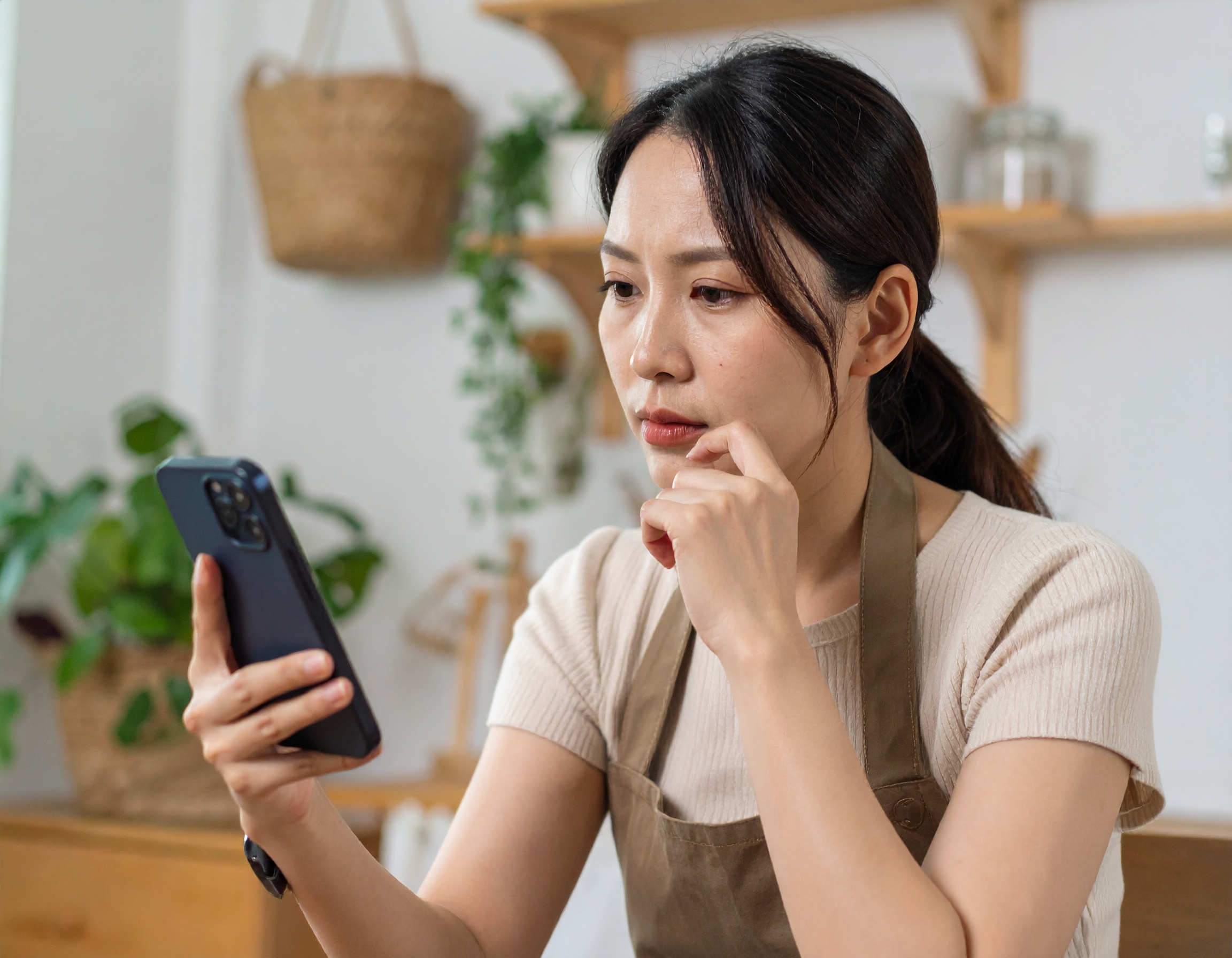 不安エプロン姿の日本人女性が、スマートフォンを見つめながら口元に手を当てて思案する姿が印象的な一枚。眉間にうっすらとしわを寄せ、悩みや戸惑い、決断に迷う感情が表れています。家庭内での葛藤や情報に対する不安を表現するAI素材として、ライフスタイルや家族・心理系のコンテンツに適しています。