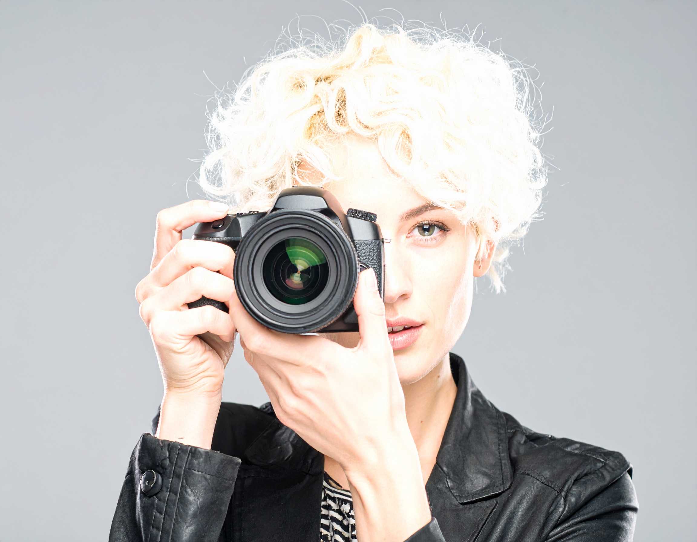 ショートカールの髪と革のジャケットが印象的な女性フォトグラファーが、カメラのファインダー越しにこちらを見つめる一瞬をとらえた一枚。背景はシンプルで被写体にフォーカスが当たり、プロフェッショナルとしての集中力と美意識が感じられます。クリエイティブ、アート、仕事、ポートレート関連の素材に最適です。