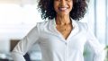 自信ショートカールの髪と革のジャケットが印象的な女性フォトグラファーが、カメラのファインダー越しにこちらを見つめる一瞬をとらえた一枚。背景はシンプルで被写体にフォーカスが当たり、プロフェッショナルとしての集中力と美意識が感じられます。クリエイティブ、アート、仕事、ポートレート関連の素材に最適です。