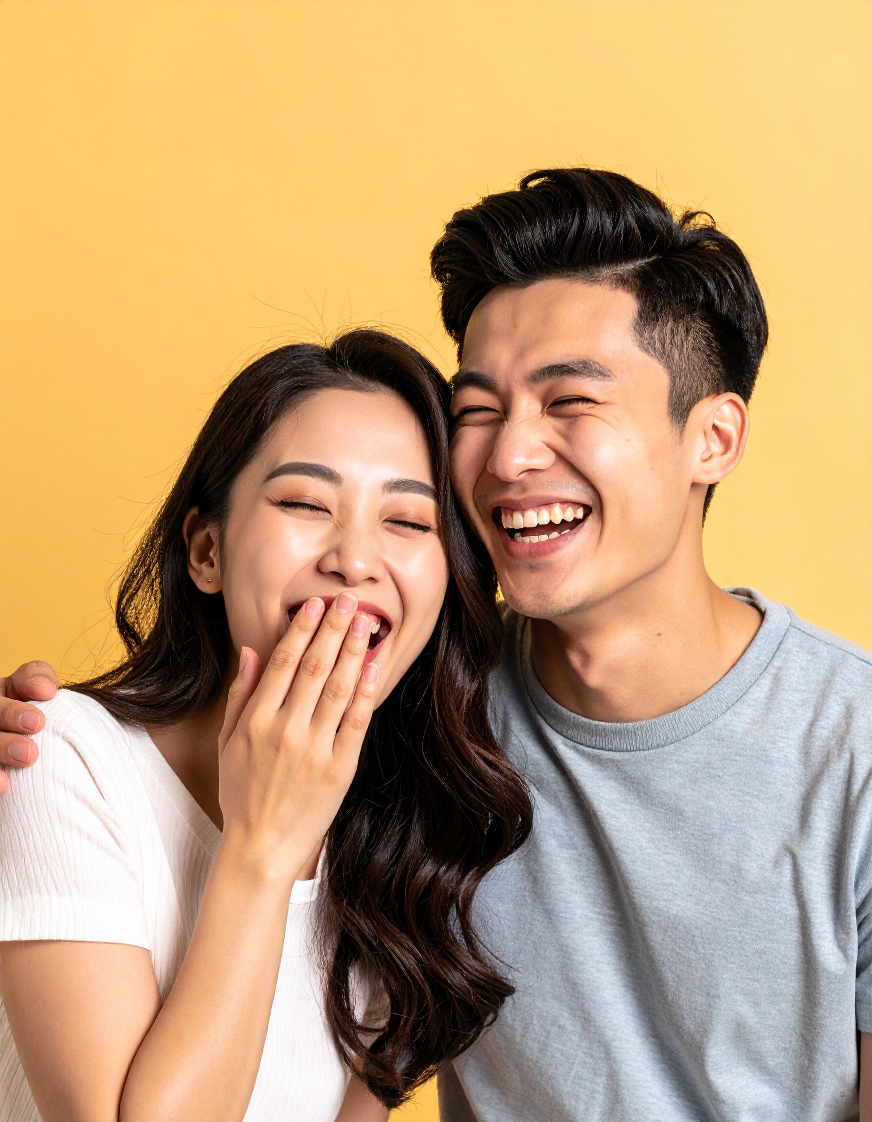 明るいイエローの背景に映える、若いカップルの満面の笑顔。自然な表情とぴったり寄り添うポーズが、仲の良さや楽しさを存分に伝えてくれます。恋愛や日常の幸せをテーマにしたデザインや広告にもぴったりな、ポジティブな印象の一枚です。