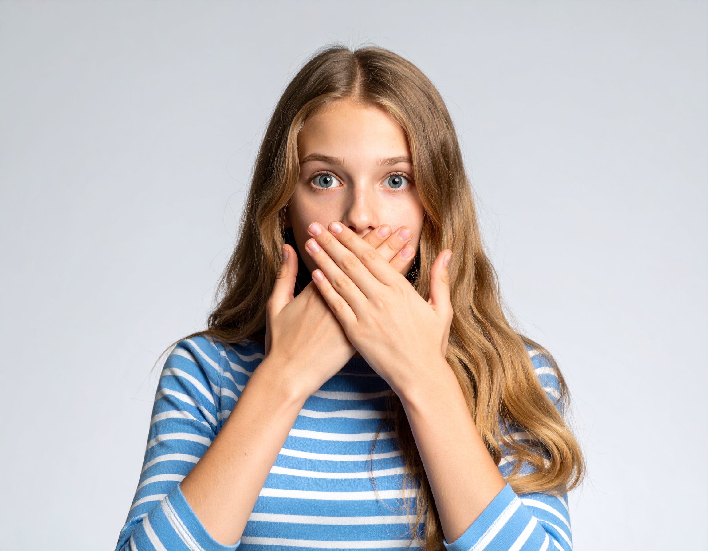 混乱青と白のボーダーシャツを着たティーンエイジャーの少女が、両手で口を押さえて目を見開いている様子を捉えた画像です。驚きやショックを受けた瞬間をリアルに表現しており、思わず息をのむような場面や感情の揺れを伝えたいシーンに最適な素材です。SNSの反応やリアクション表現などにも使えます。
