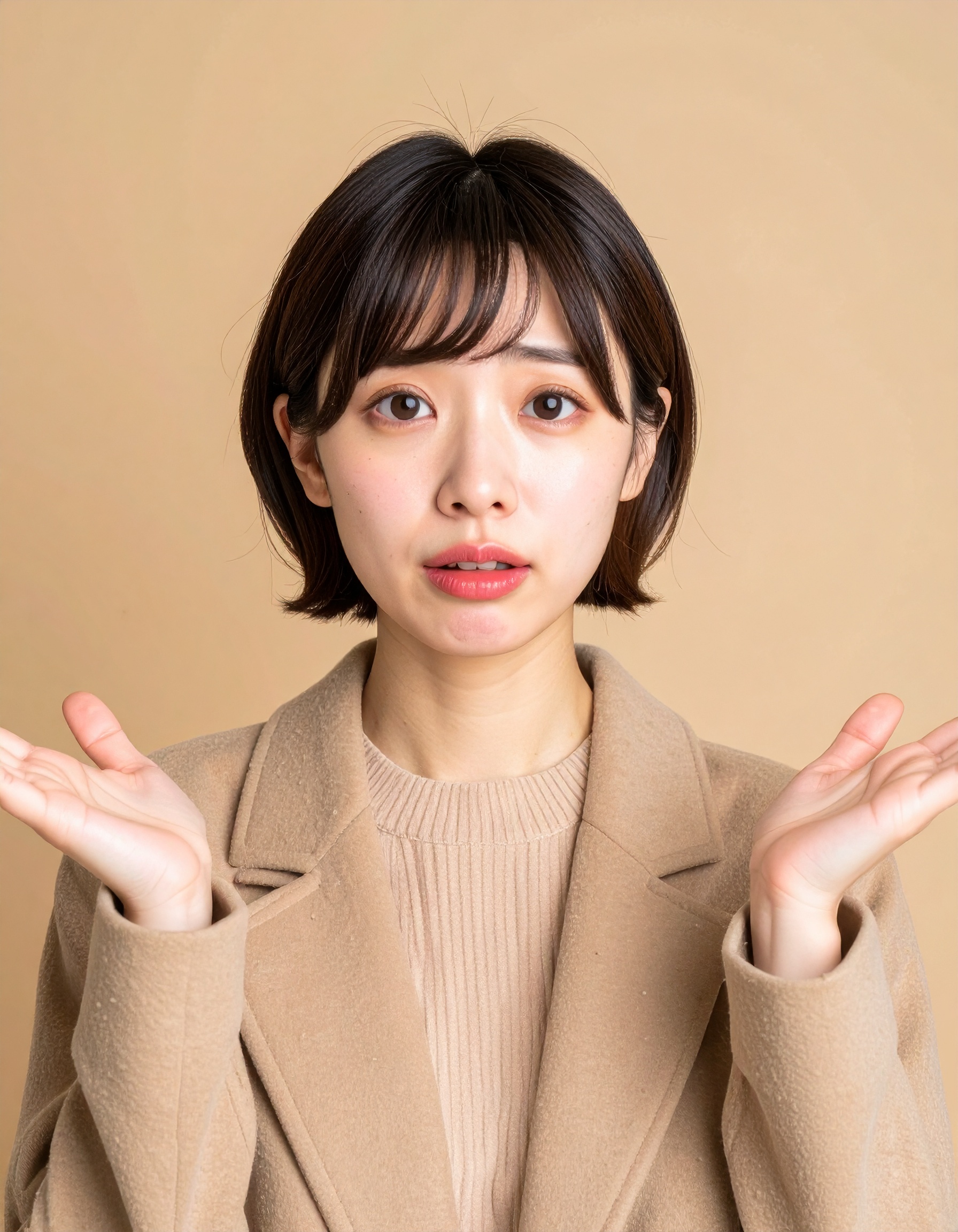 困惑した表情で戸惑いを見せる女性 混乱 2025.07.03 両手を軽く上げ、困ったような表情を浮かべる若い女性。戸惑いや「どうしよう?」といった不安げな感情をストレートに伝える一枚で、混乱や疑問、説明不足のシーンなどにぴったりの感情表現素材です。 DownLoad Small sizeMedium sizeLarge size この記事のタグ:#ベージュ背景#不安#困る#困惑#感情表現#戸惑い#手を広げる#考え中#若い女性#説明不足