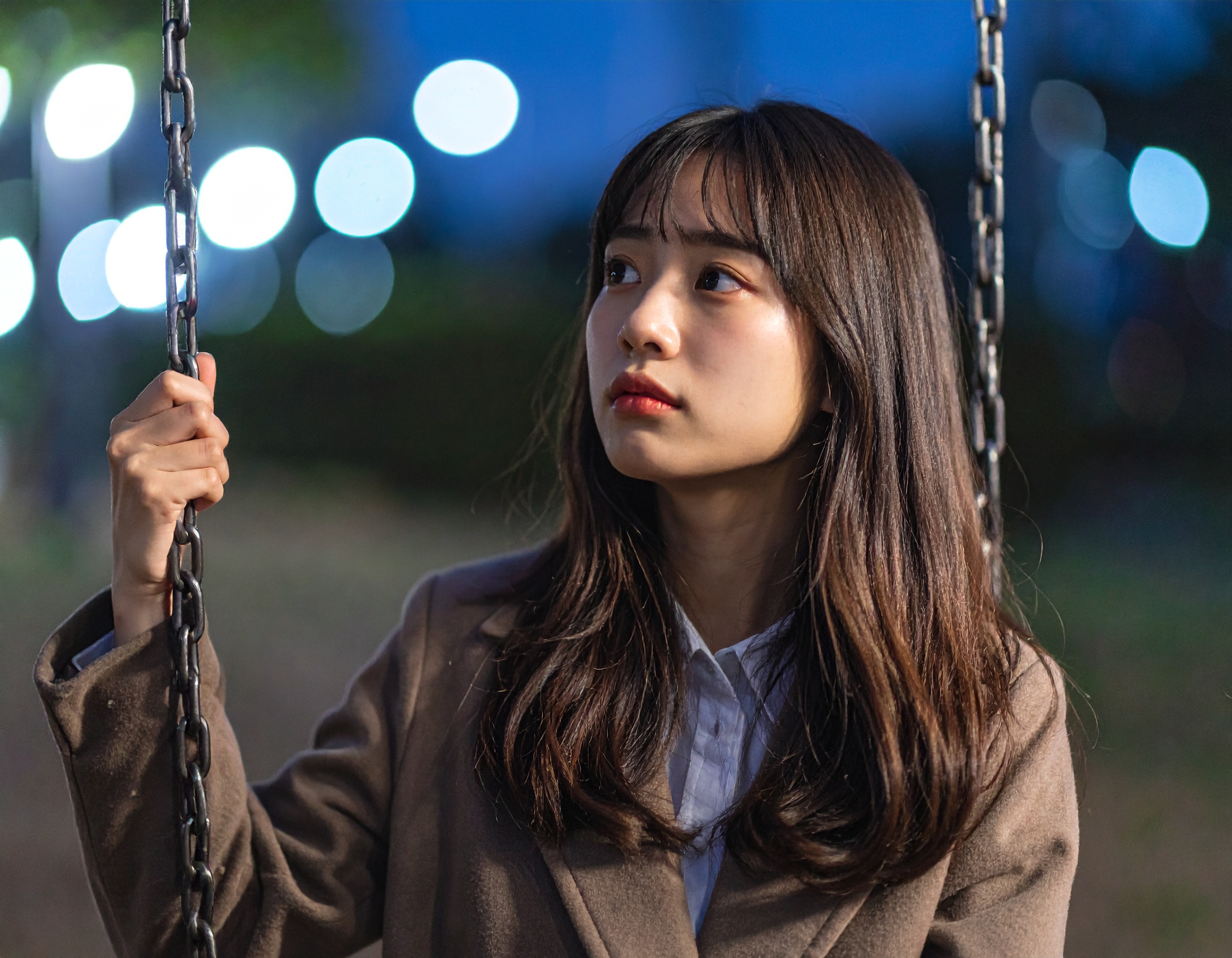 夜の公園でブランコに座り、切なげに見上げる女子学生。街灯のぼんやりとした灯りと彼女の表情が、孤独や葛藤、心の揺れを繊細に表現しています。青春の迷いや感情の機微をテーマとしたメンタルヘルス、ドラマ性のある記事、詩的なSNS投稿などに適した一枚です。