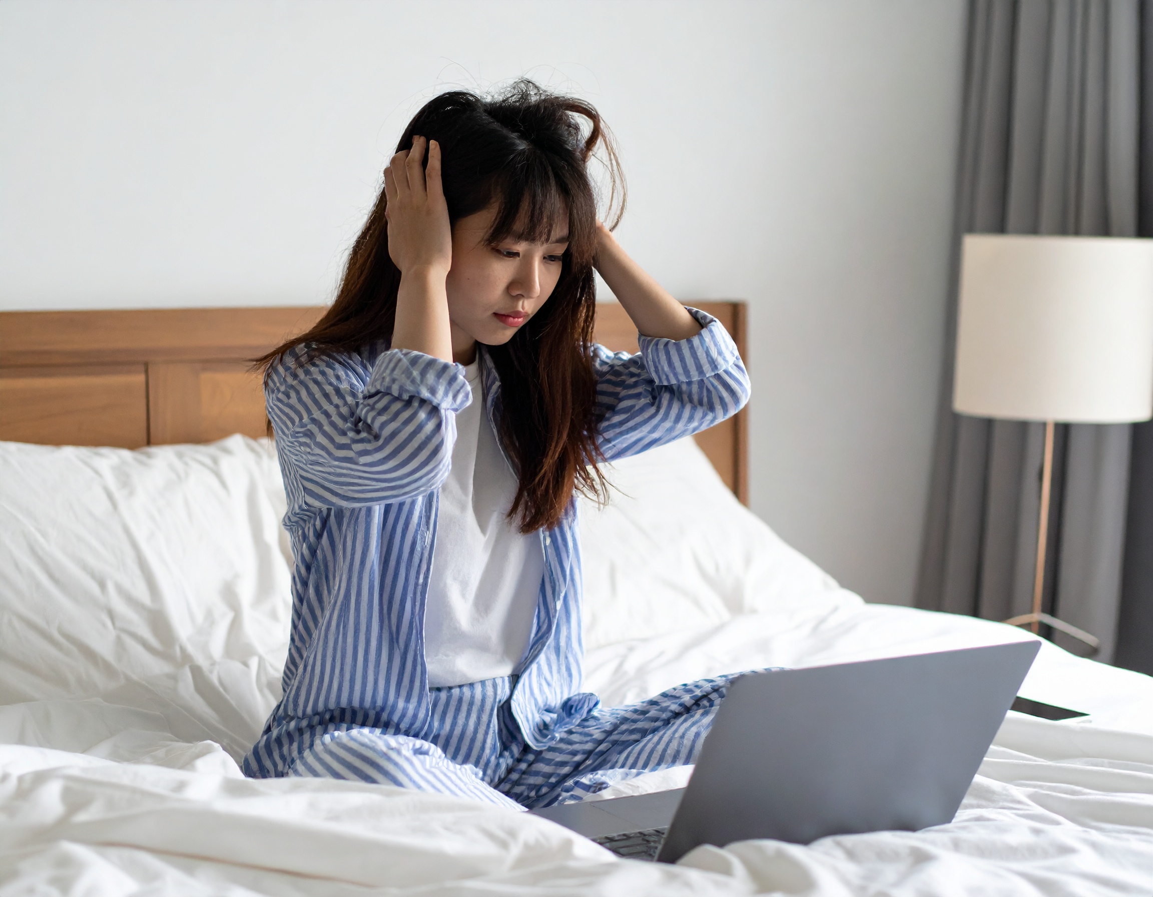 ストレスベッドの上でパジャマ姿の若い女性が、スマートフォンを確認した直後に頭を抱えて落ち込む様子。朝の時間帯に届いた衝撃的な内容のメッセージに、動揺と混乱を隠せない感情が表れている。静かな寝室の中で、一人悩みと向き合う瞬間を捉えた印象的な一枚。