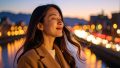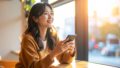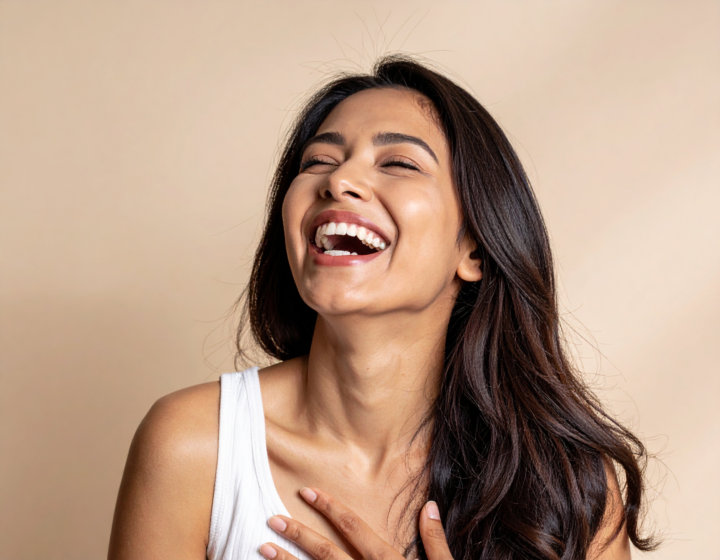 大きく口を開けて笑い、目を細めるこの女性の表情からは、心の底から楽しんでいる様子が伝わってきます。何気ない日常の中での「笑い」が、見る人の気持ちまで明るくしてくれる一枚です。自然体で感情を表現するこの姿は、ポジティブな気持ちを引き出したい場面にぴったりです。