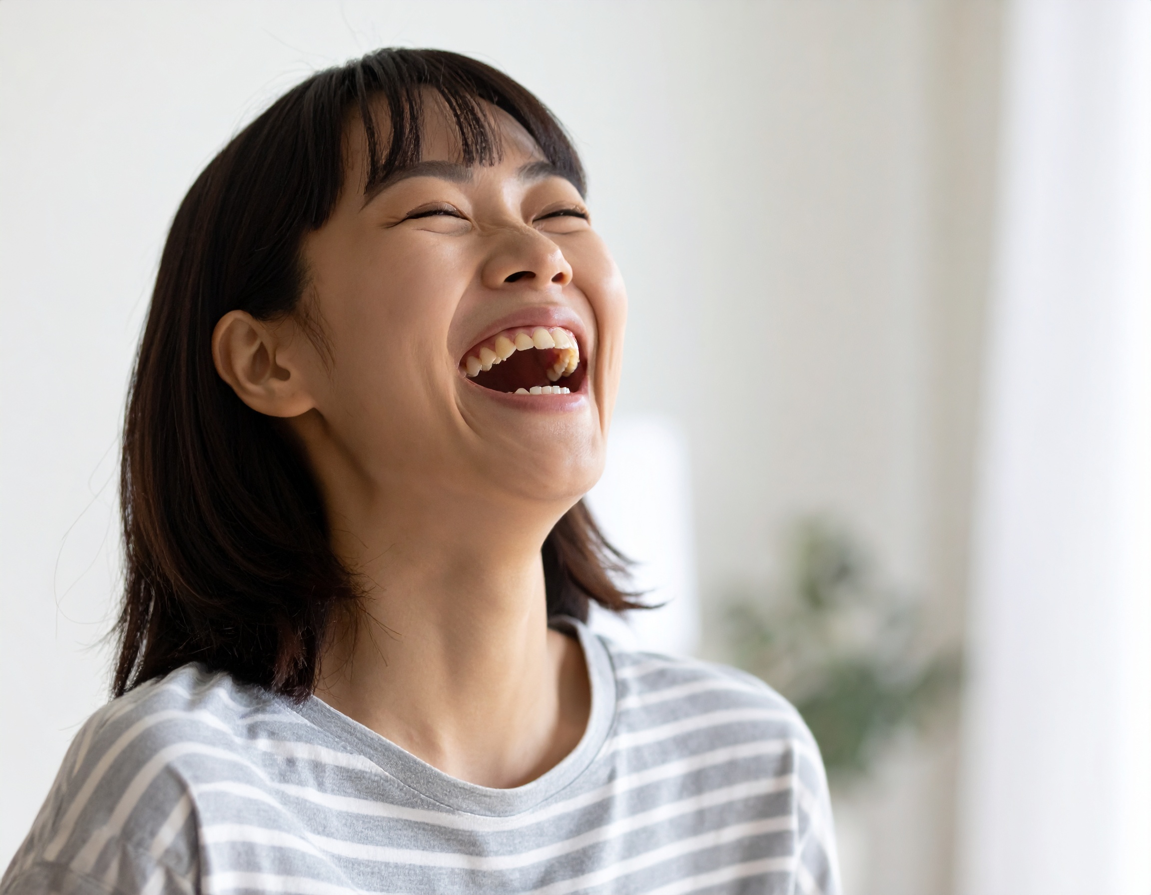 ストライプのトップスを着た日本人女性が、思いきり笑顔を見せている瞬間を捉えた一枚。自然体で感情があふれるような笑顔が魅力的で、楽しさや幸せ、リラックスした雰囲気を伝える素材として活用できます。日常の喜びやコミュニケーション、ポジティブなメッセージにぴったりのビジュアルです。