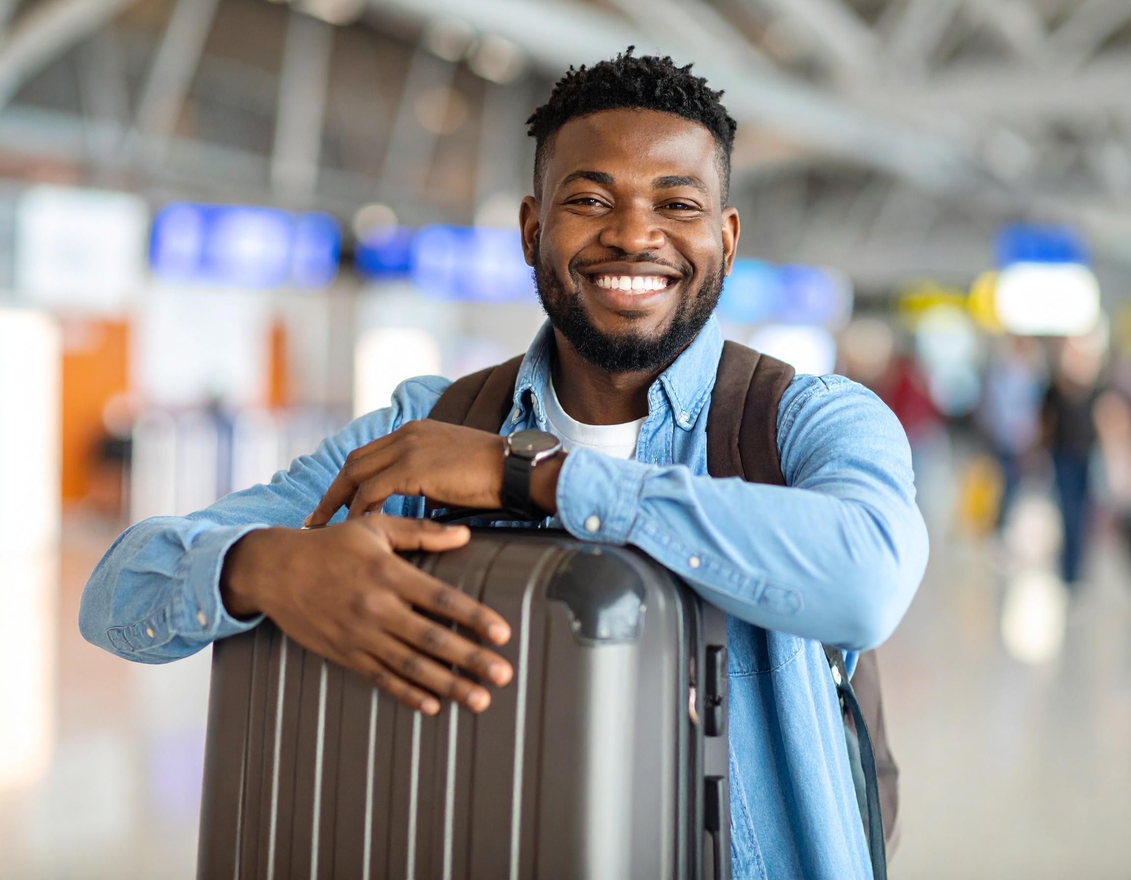 空港でスーツケースを見つけ、安心したような笑顔を浮かべる旅行者の男性。背景には旅の高揚感あふれる出発ロビーの様子がぼんやりと広がり、旅立ちのワクワク感や移動の安心感が伝わる一枚です。旅行、海外生活、空港利用、出発の瞬間をテーマにしたブログや広告に最適な写真素材です。