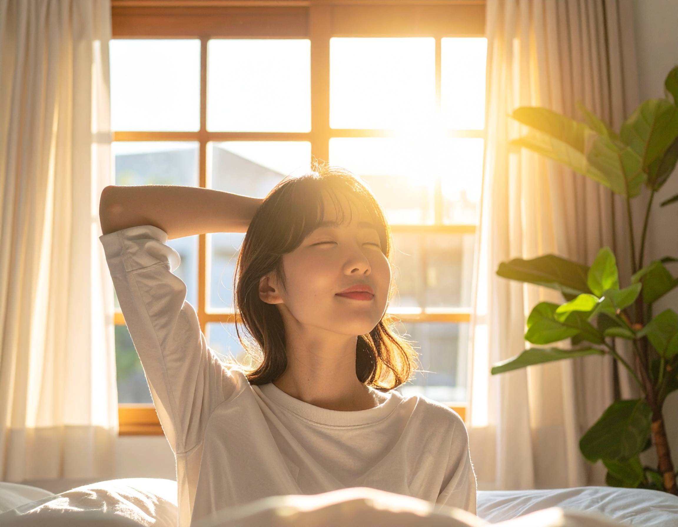 柔らかな朝日が差し込む窓辺で、心地よさそうに目を閉じて伸びをする女性。白いルームウェアに身を包み、自然光に照らされた穏やかな表情からは、心身ともにリフレッシュされる瞬間が伝わってきます。観葉植物と木製の窓枠が、清潔感とナチュラルな雰囲気を演出し、一日の始まりを爽やかに彩ります。