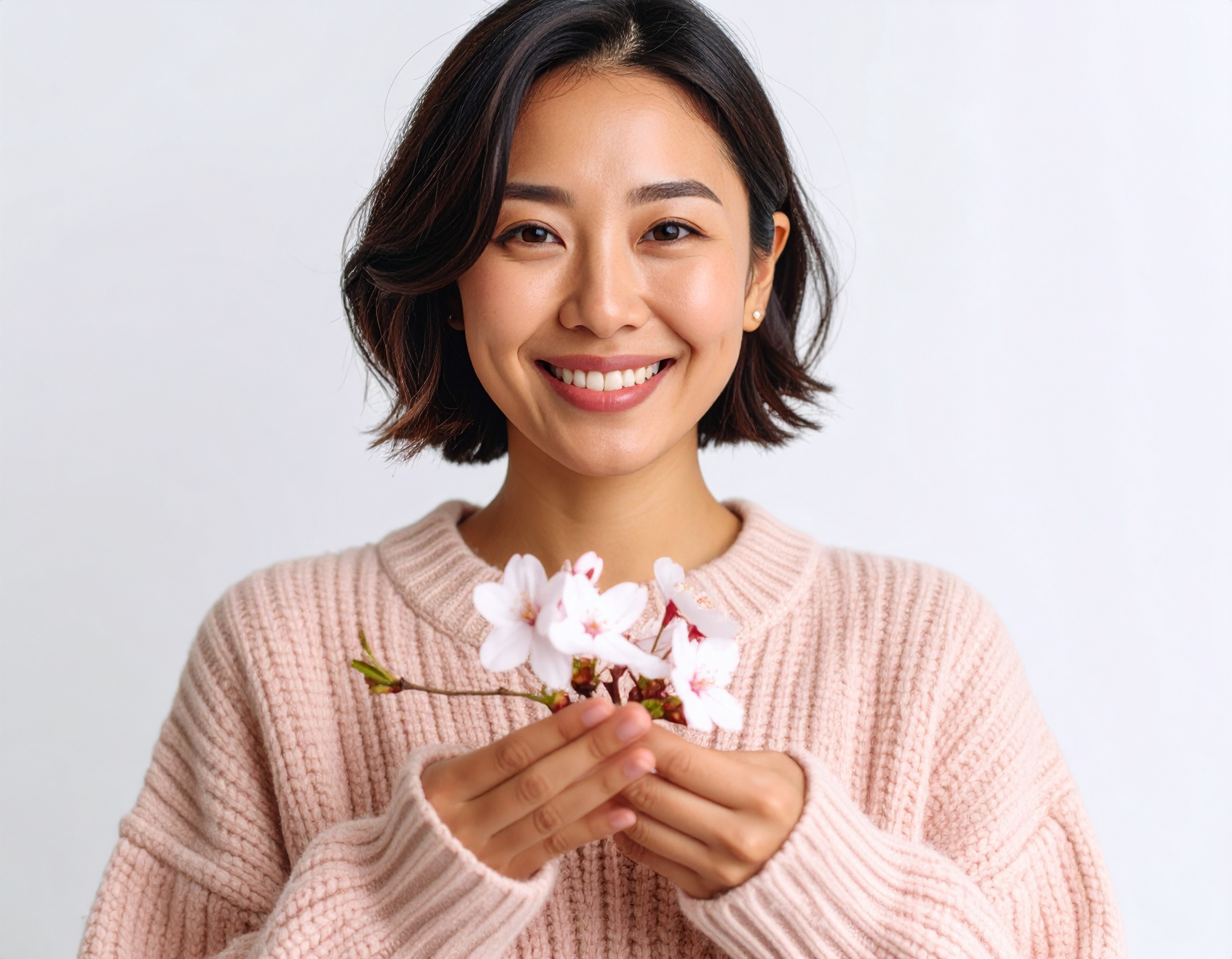 桜と微笑む春の日 安らぎ 2025.06.13 桜の小枝を両手で優しく包み込み、やわらかく微笑む日本人女性。ピンクのニットと白背景が春の清らかさを引き立て、見る人にあたたかさと穏やかな幸福感を与える一枚です。季節感や前向きな気持ちを伝える素材として最適です。 DownLoad Small sizeMedium sizeLarge size この記事のタグ:#ナチュラル#ピンク#優しさ#女性#微笑み#春#桜#癒し#穏やか