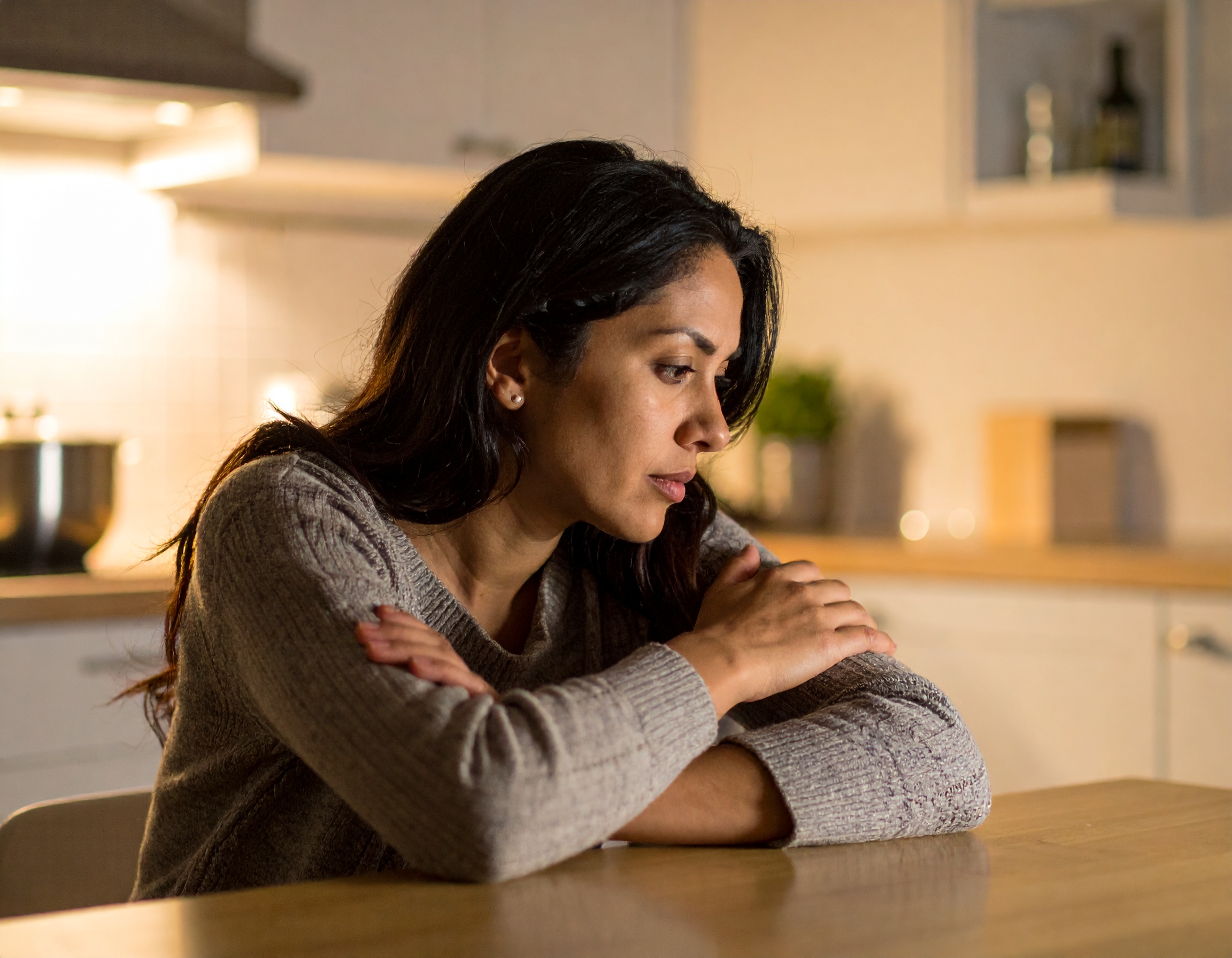 不安キッチンのテーブルに腕を置き、静かにうつむく女性の姿が、心の奥に抱える不安や悩みを物語る一枚。家族や生活、人間関係などにまつわる感情的なトピックにマッチするビジュアルです。メンタルヘルス、孤独、自己対話、ライフストーリーを扱う記事やSNS投稿に最適。