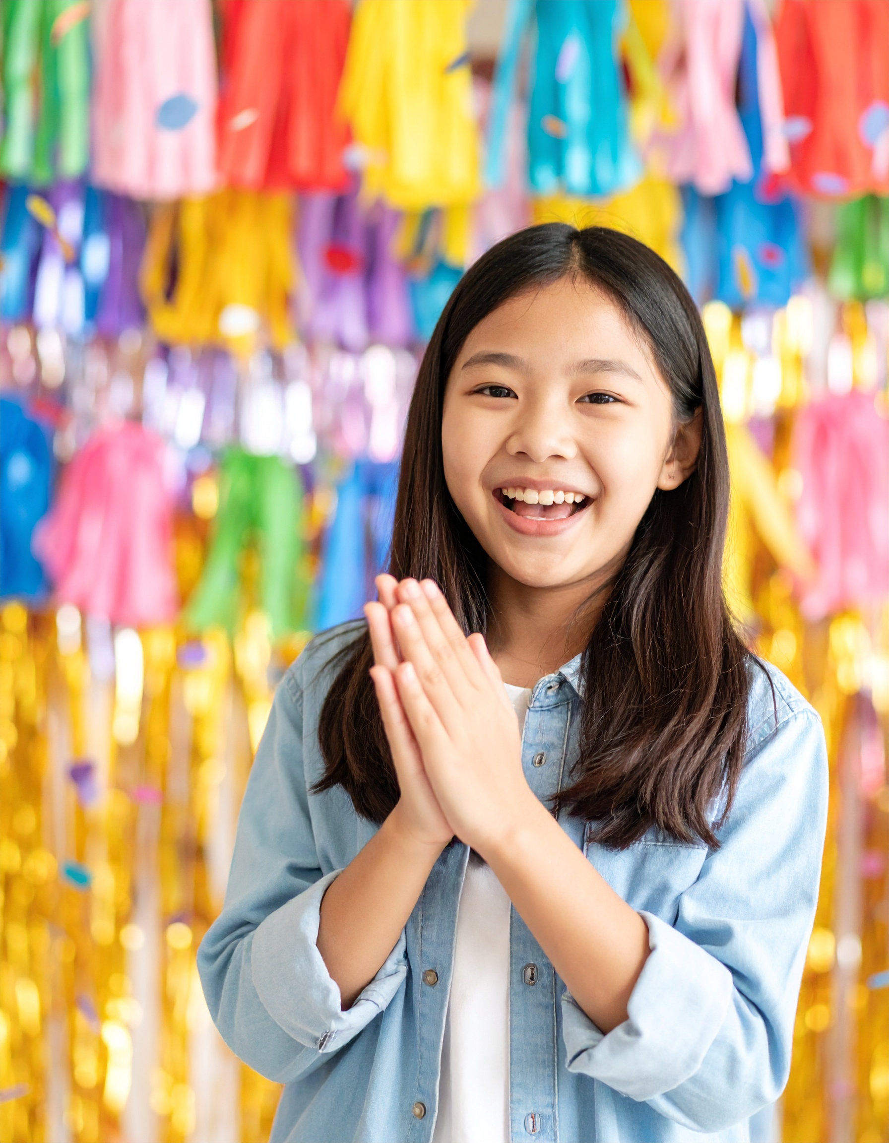 カラフルな装飾を背景に、手を合わせて満面の笑顔を浮かべる少女の姿が、祝福の瞬間や心からの喜びを伝えるポートレート。背景のきらめきと彼女の明るい表情が合わさり、イベントやハレの日の空気感をそのまま写し出しています。お祝い・感謝・ポジティブな感情を伝える場面にぴったりの素材です。
