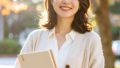 秋の公園で微笑む母と子