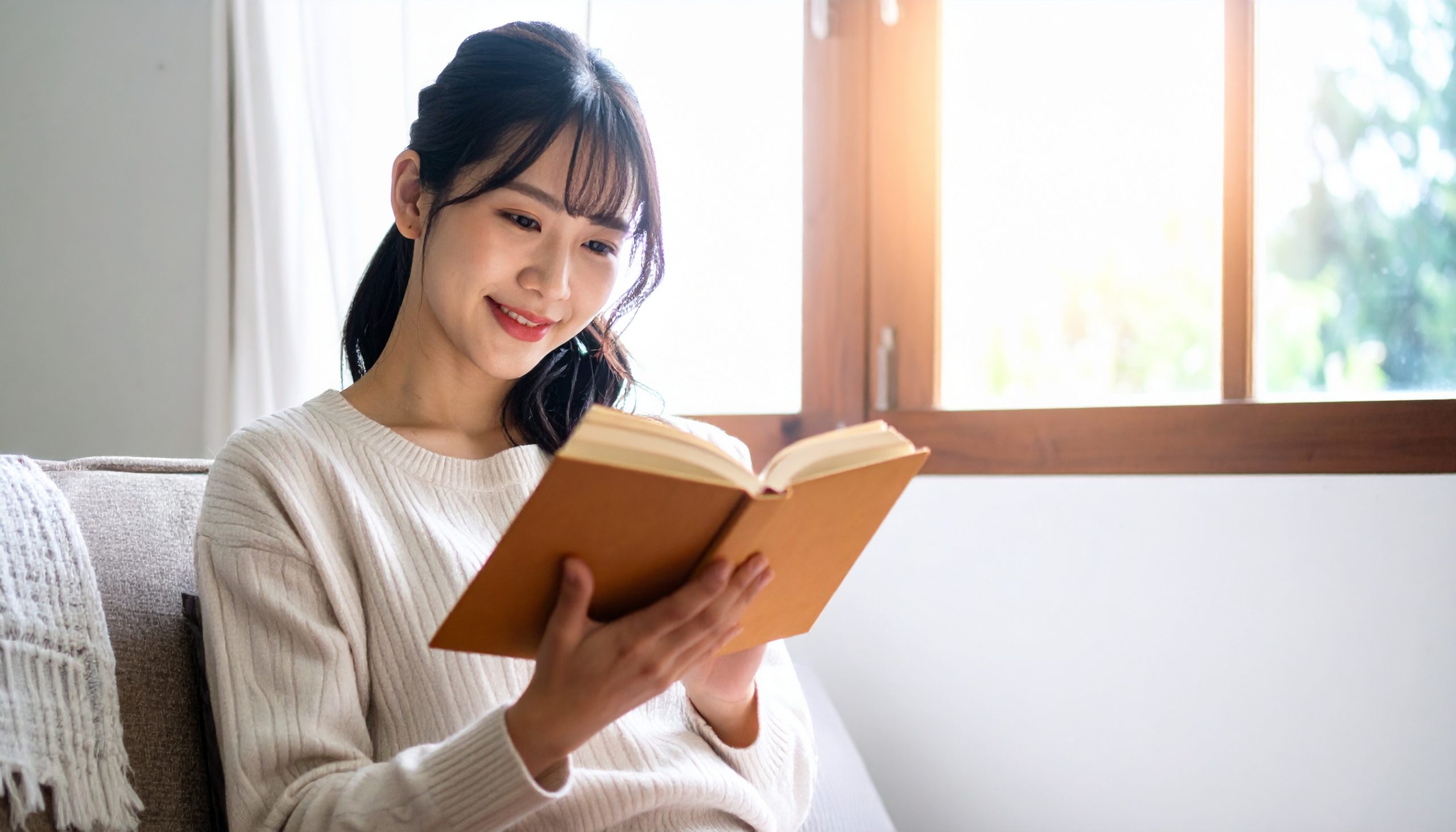窓から差し込む柔らかな光に包まれながら、ソファで本を読む女性の姿。リラックスした表情からは、静かな時間と心の充実が伝わります。インテリア、ライフスタイル、趣味、自己啓発など幅広いテーマに活用できる写真素材です。
