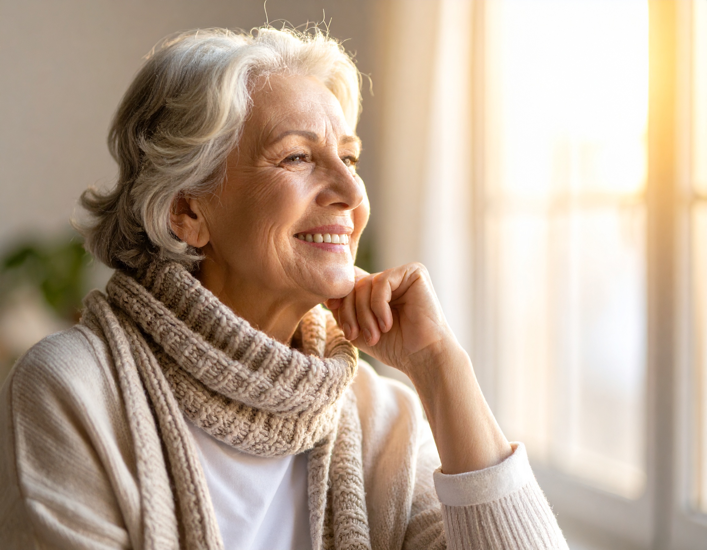 穏やかな笑みで窓の外を見つめるシニア女性