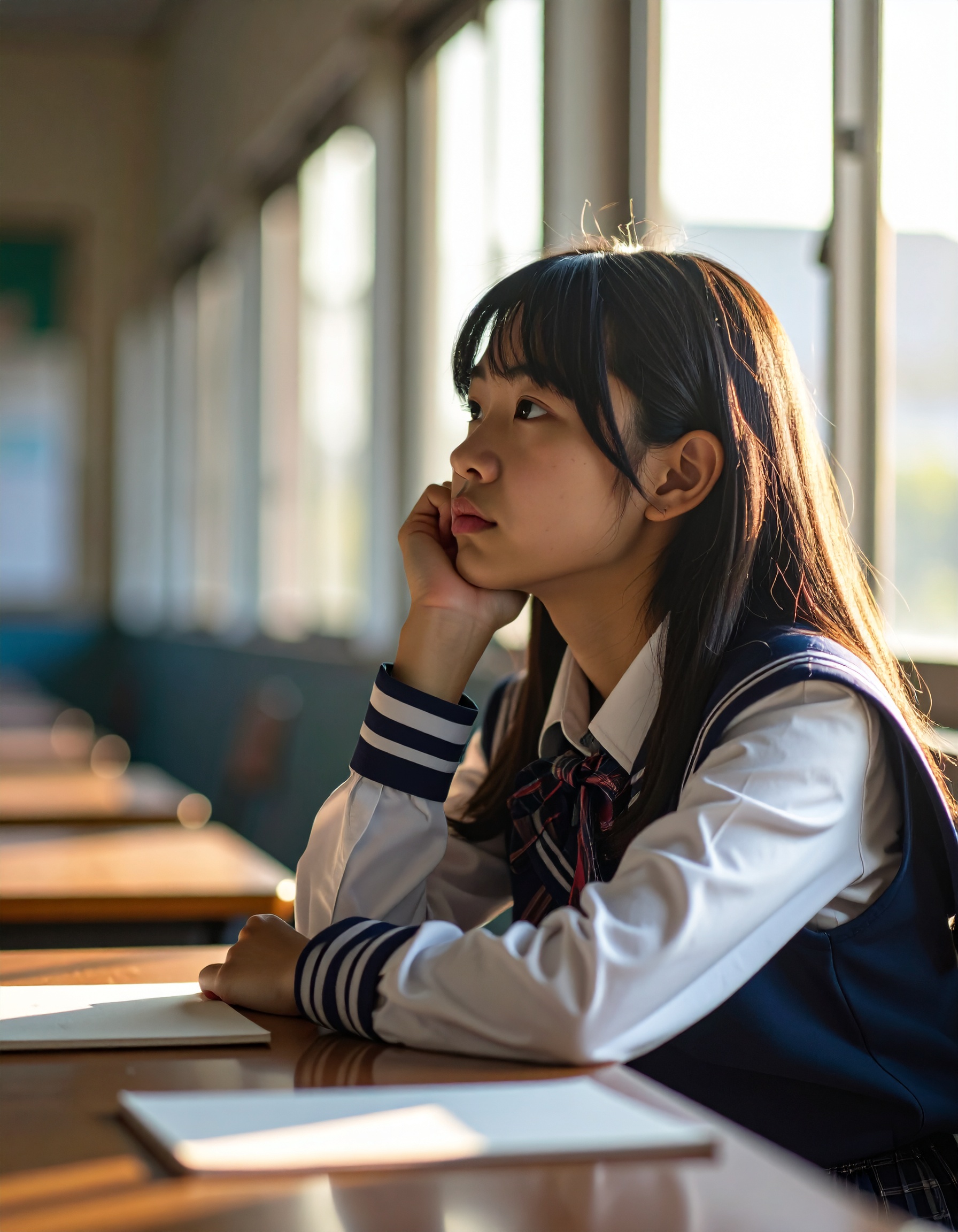 不安放課後の教室で、窓の外を静かに見つめる日本人女子高校生。頬杖をつき、どこか寂しげで考え込むような表情が印象的です。青春の葛藤や将来への不安、日常の中に潜む感情の揺れを繊細に表現した一枚。教育、心理、若者の心情を扱うコンテンツに適しています。