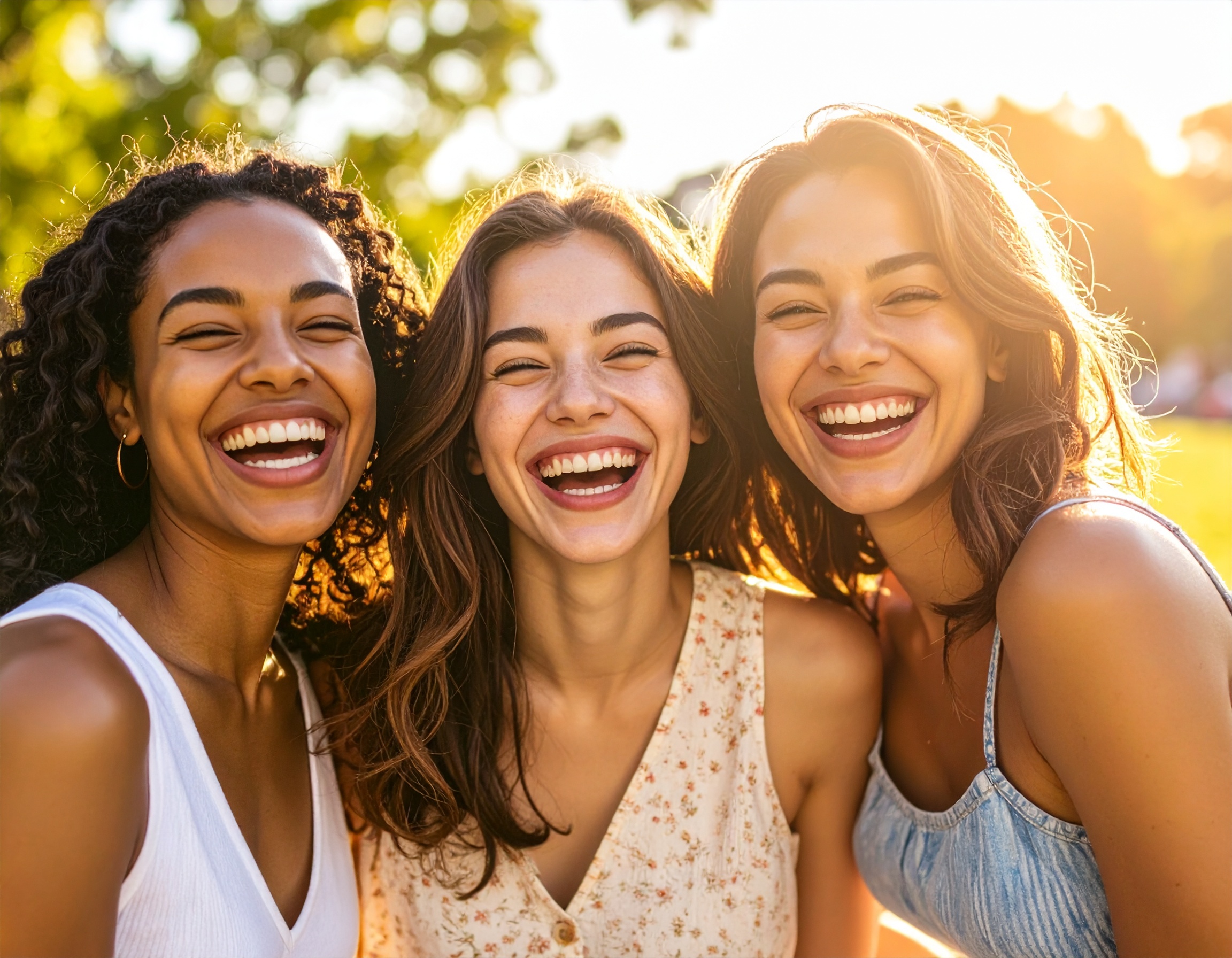 まぶしい夕陽のなかで、心からの笑顔を見せる3人の女性たち。
