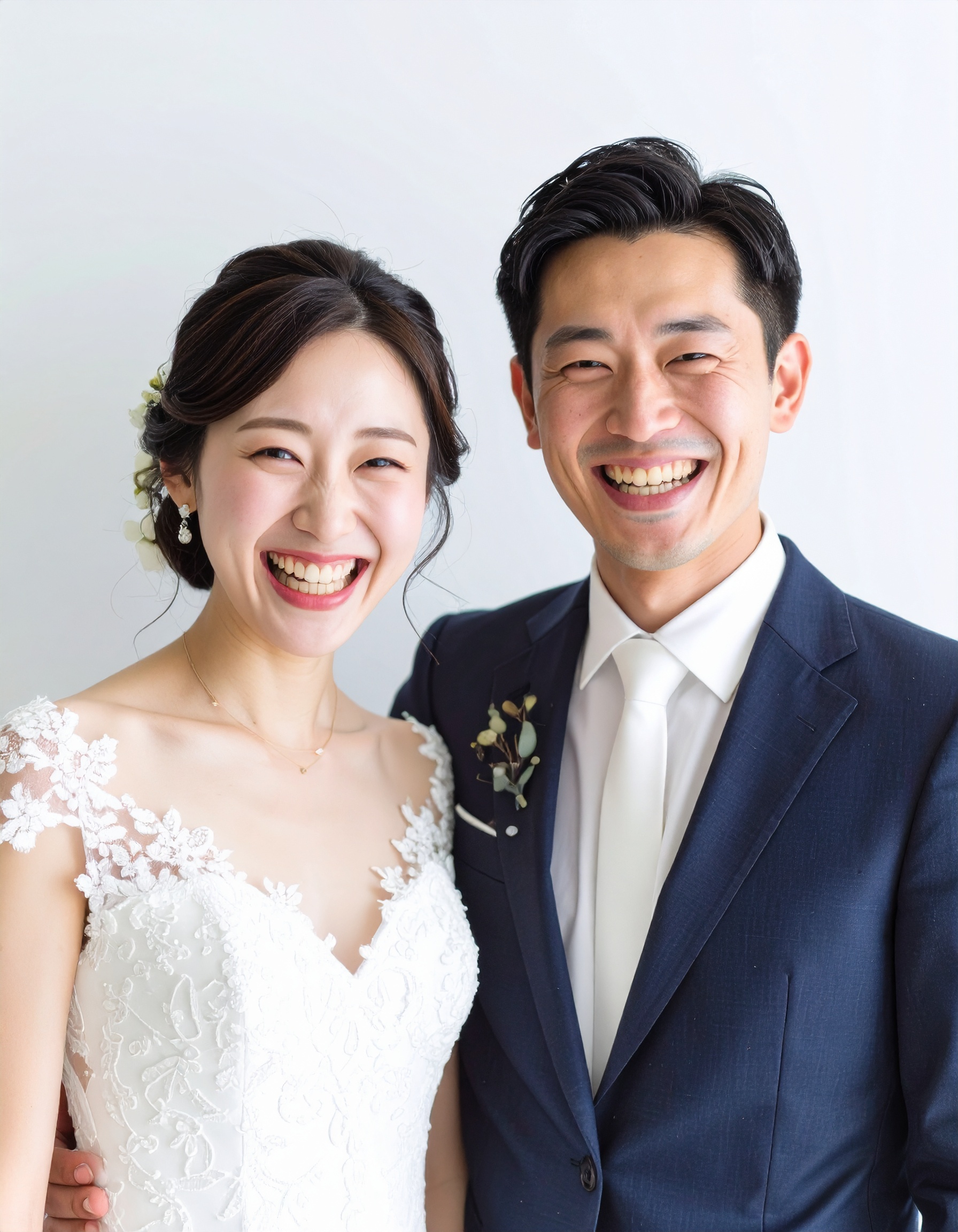 白いドレスとスーツに身を包んだ日本人の新郎新婦が、まばゆい笑顔で並ぶ結婚写真。新たな人生の門出を心から喜ぶ表情が印象的で、愛と幸せ、祝福の瞬間が詰まった一枚です。ブライダル・ウェディング・幸せなカップルなどのテーマにぴったりな素材です。