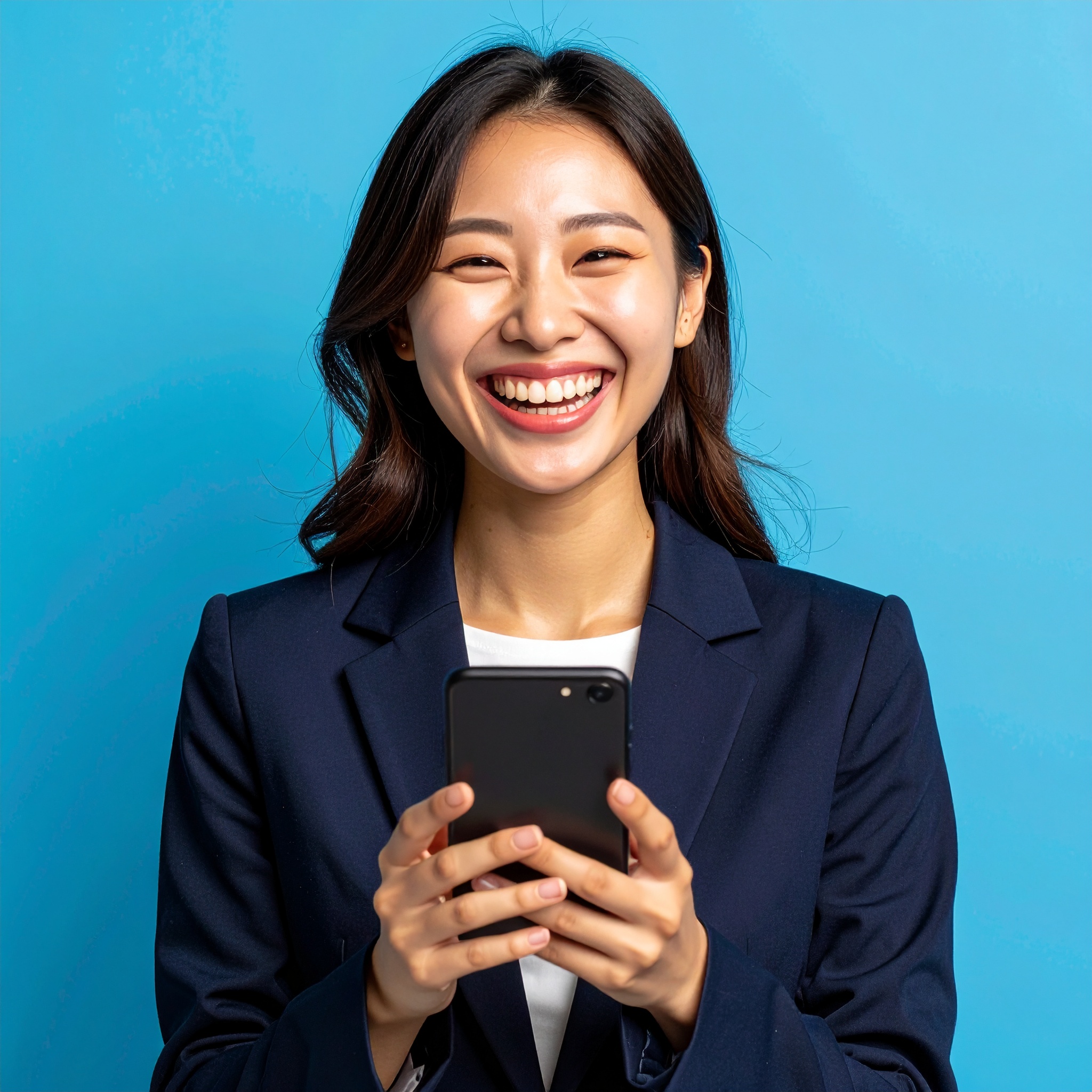 笑顔スマートフォンを手に、明るい笑顔を見せる日本人のビジネスウーマンを撮影した一枚。ブルーの背景が清潔感と爽やかさを引き立て、ポジティブで信頼感のある印象を与えます。ビジネス・就職・コミュニケーション・SNS・働く女性をテーマとしたブログや広告、プレゼン資料に最適な素材です。