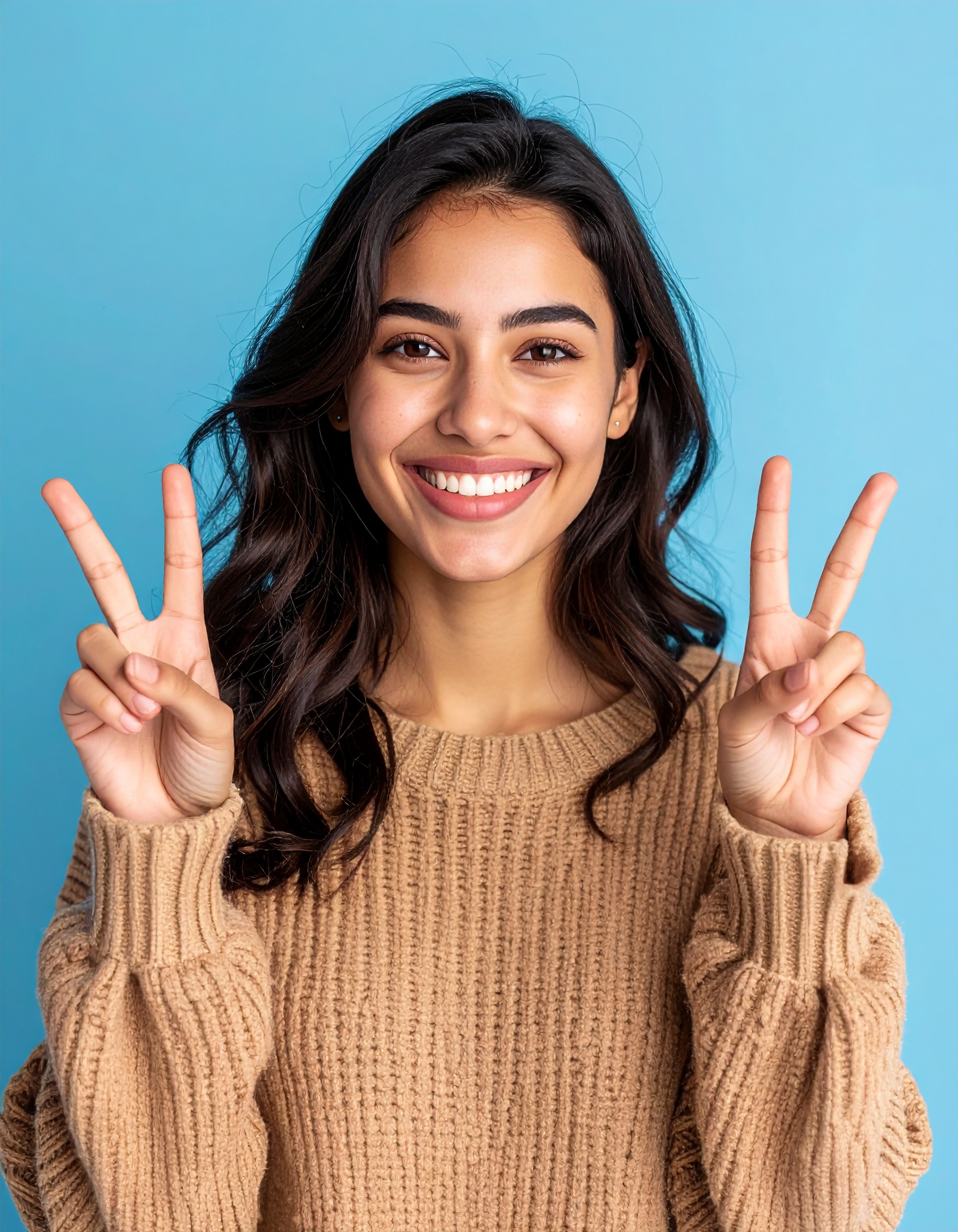 明るい笑顔と両手のピースサインが印象的な女性の画像です。ポジティブな気持ちや前向きな感情、楽しさを視覚的に伝えたい場面にぴったりの素材です。爽やかな背景と自然な表情が見る人の心を明るくします。SNS投稿、Webサイト、広告、プレゼン資料などに幅広く活用できます。
