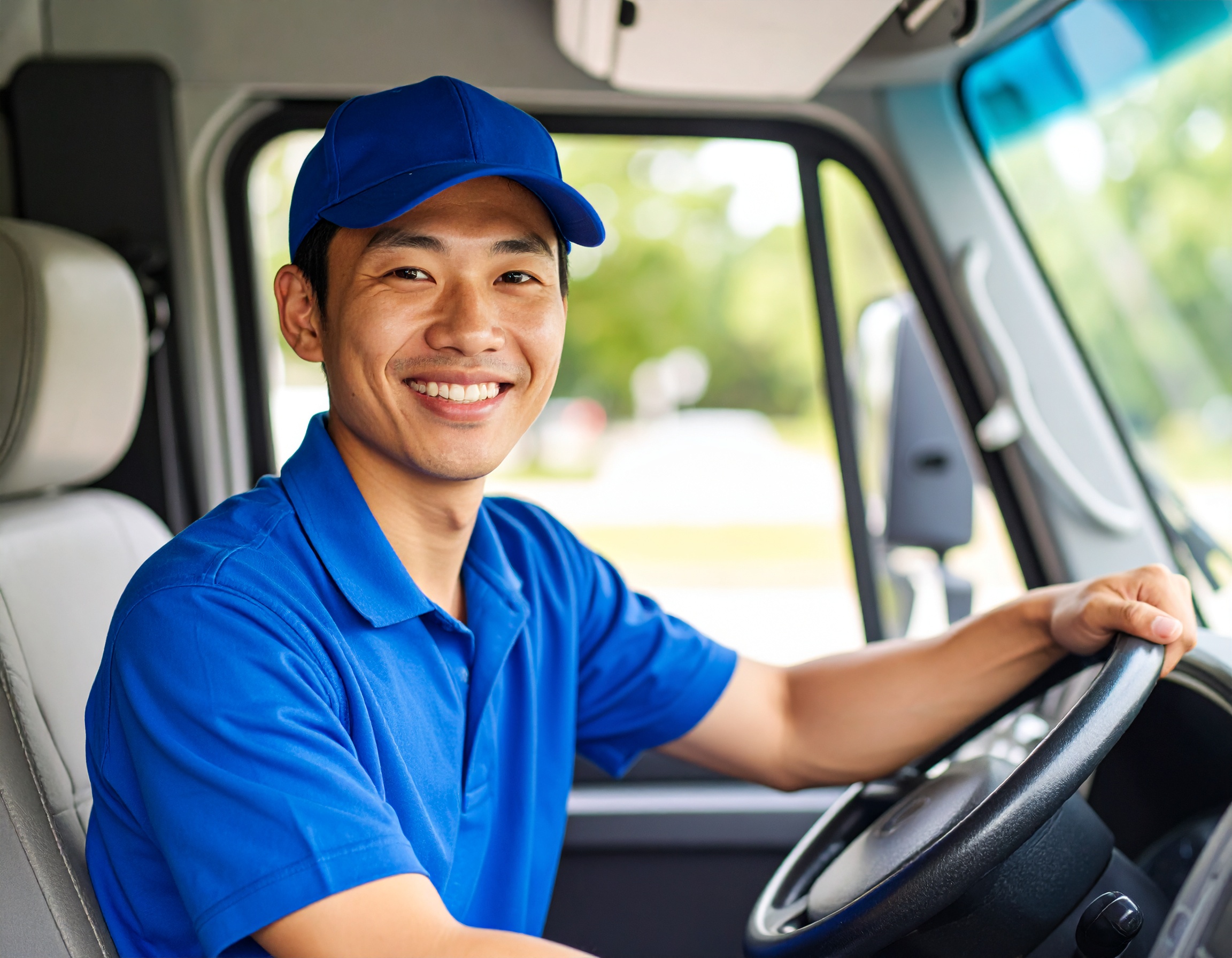 青いユニフォームとキャップを着用し、トラックの運転席から明るい笑顔を見せる男性ドライバーの写真です。プロフェッショナルで親しみやすい雰囲気が伝わり、物流・配達サービスや顧客対応の良さをアピールするコンテンツに最適です。