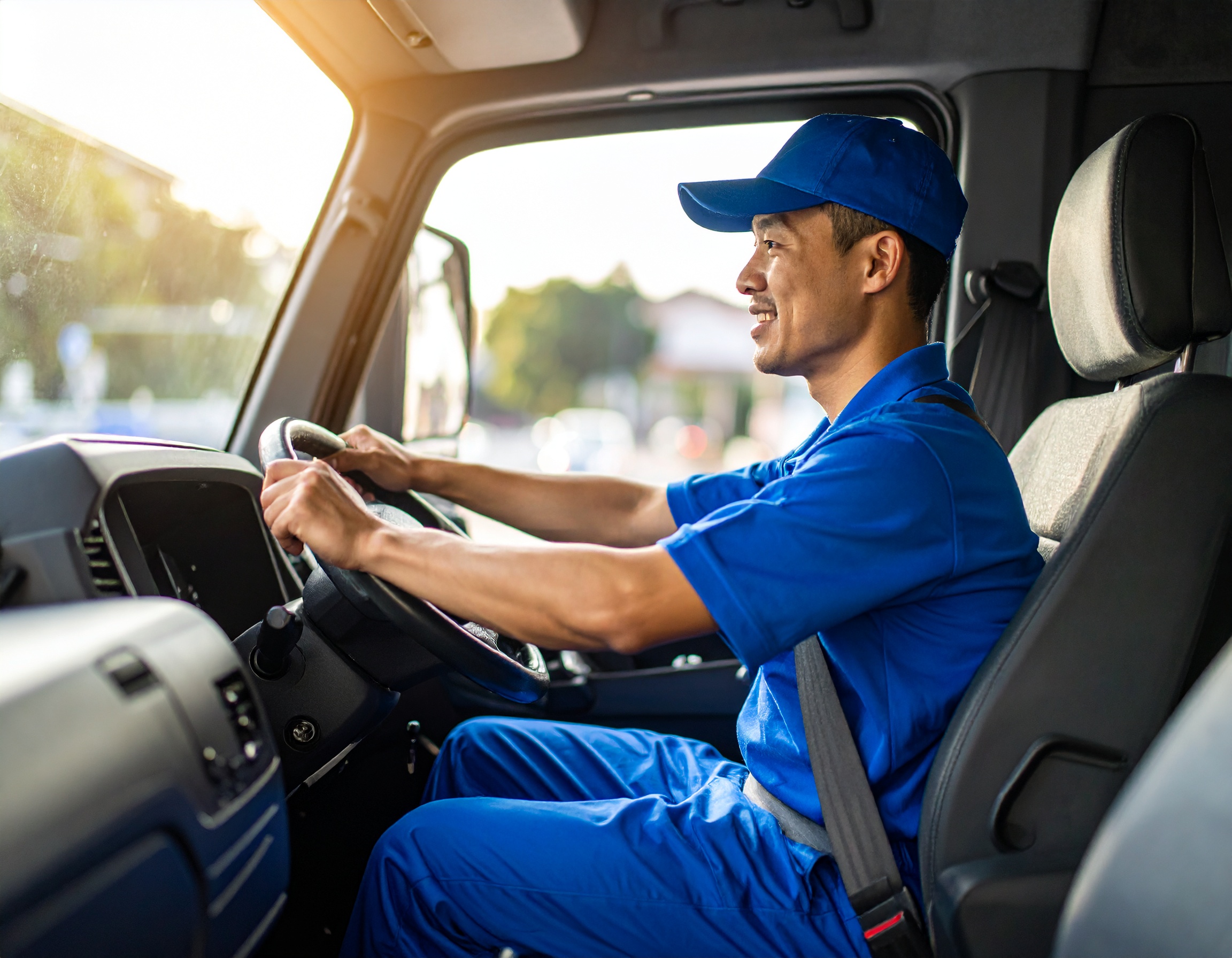 安心青い制服とキャップを身につけた配送ドライバーが、トラックを運転しながら笑顔を見せているシーンです。安全運転と誠実さを感じさせる表情は、物流や配送業務のポジティブなイメージを伝える素材として最適です。仕事への責任感や前向きさを表現したい場面で活用できます。
