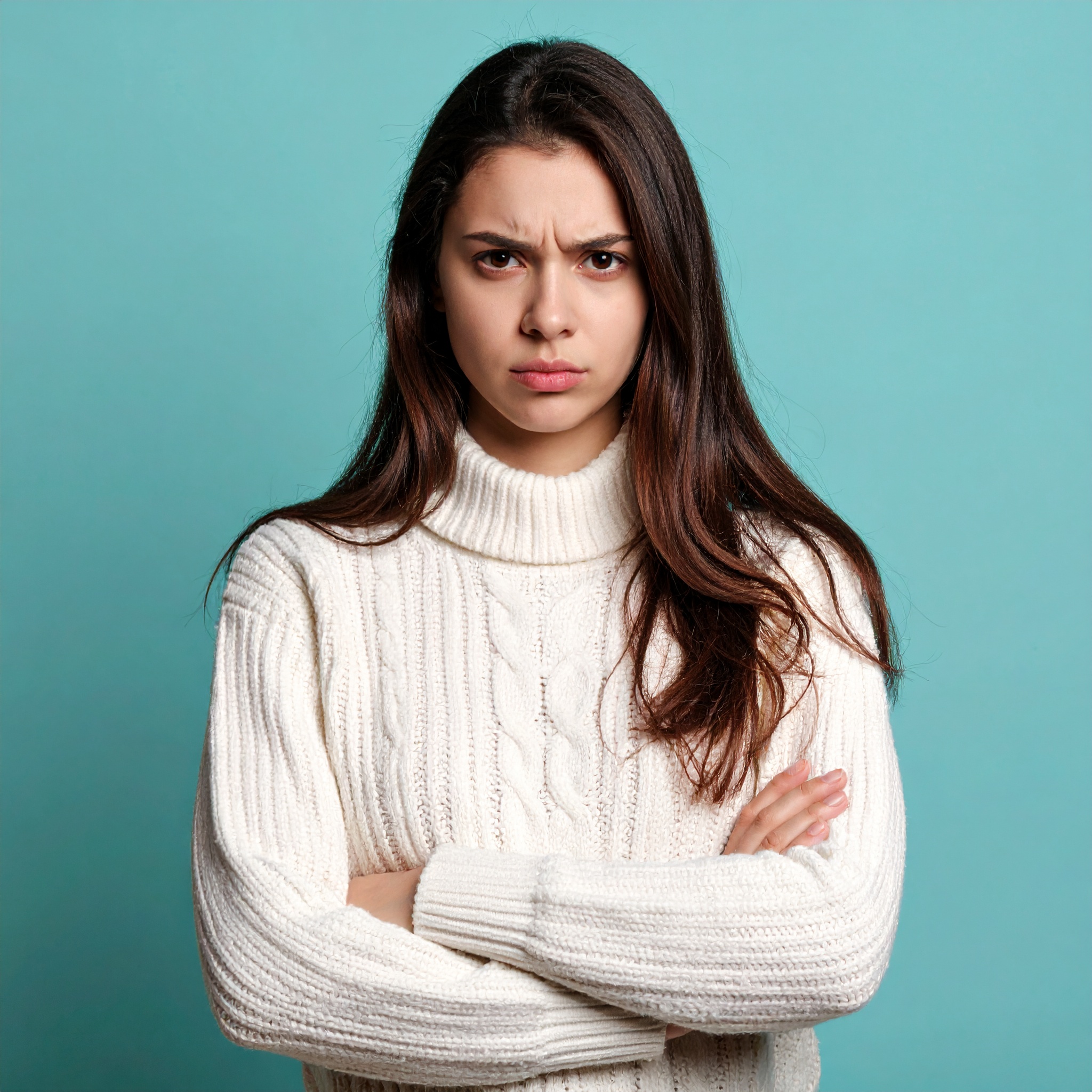 不満白いセーターを着た若い女性が腕を組み、眉をひそめて真正面から睨むような表情を浮かべる姿。明るい背景との対比で、怒りや不満、警戒心が一層際立つ印象的な一枚です。人間関係の摩擦や意見の対立、ストレス表現など、ネガティブ感情や強い意思を示す場面に適した素材です。
