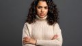 不満白いセーターを着た若い女性が腕を組み、眉をひそめて真正面から睨むような表情を浮かべる姿。明るい背景との対比で、怒りや不満、警戒心が一層際立つ印象的な一枚です。人間関係の摩擦や意見の対立、ストレス表現など、ネガティブ感情や強い意思を示す場面に適した素材です。