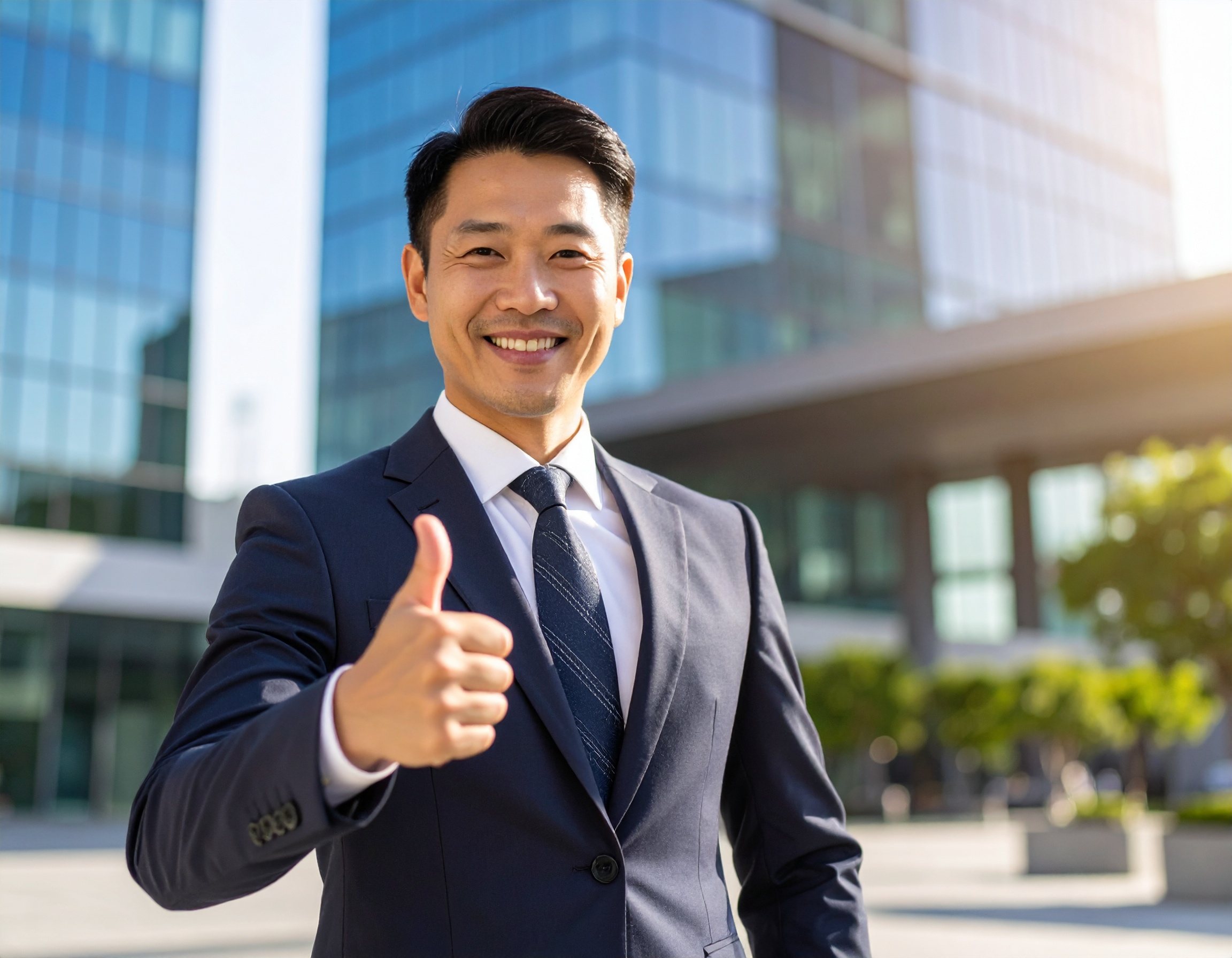 自信オフィス街の前で笑顔を見せるビジネスマンが、親指を立ててポジティブな気持ちを表現しています。成功・達成感・信頼感を象徴するシーンで、ビジネス・企業・キャリア関連の記事や広告素材に最適です。明るい朝日と近代的なビルが、前向きな印象を強調しています。