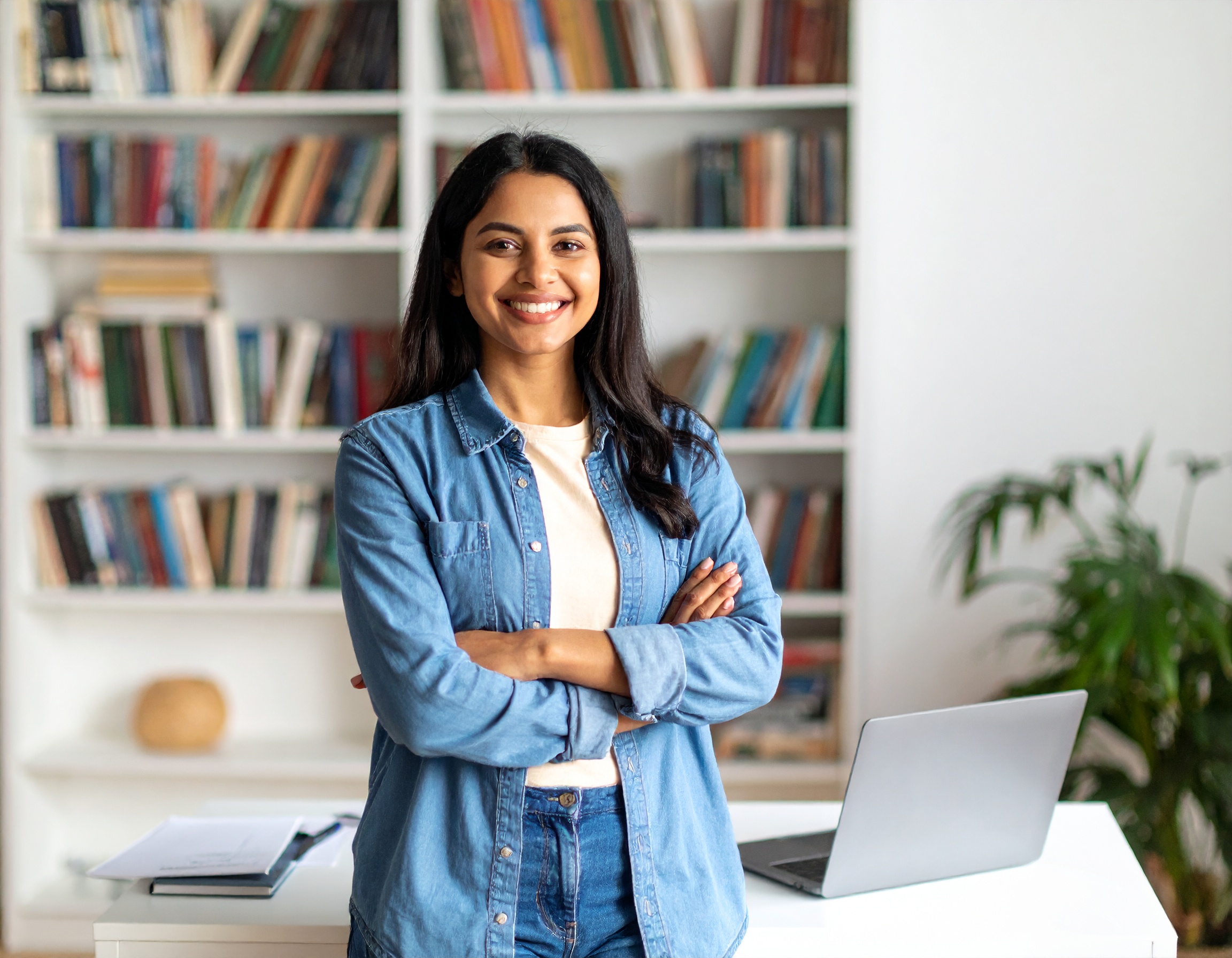 明るいホームオフィスに立つ女性が、腕を組みながら穏やかな笑顔を浮かべています。しっかりとした眼差しと姿勢からは、自信と落ち着きが感じられ、前向きな感情が伝わる一枚です。