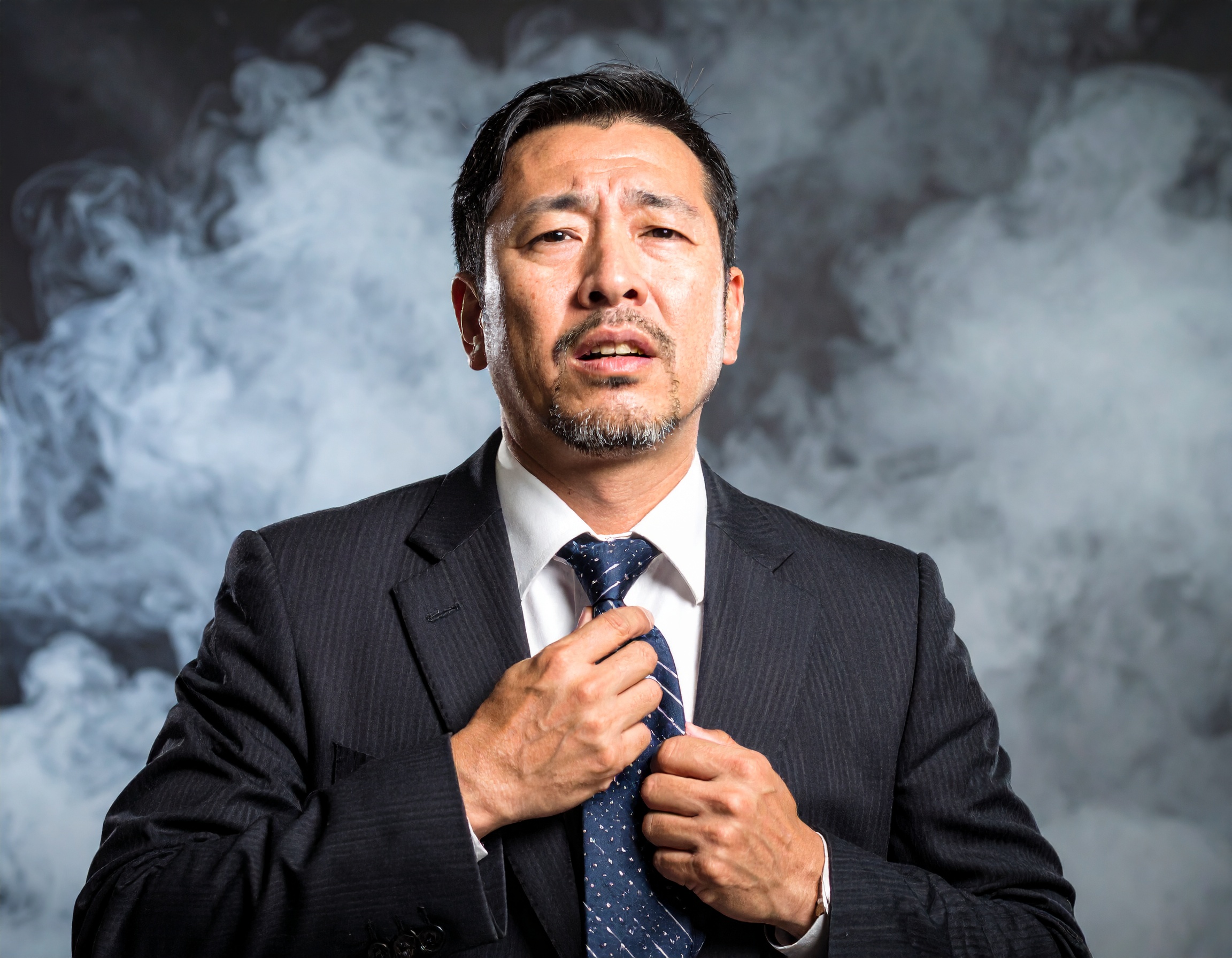 ネクタイを引き下げ、汗をにじませながら苦悶の表情を浮かべる中年のビジネスマン。背景に立ちこめる煙とともに、追い詰められた状況やプレッシャーの重さを視覚的に訴えるインパクトのある一枚です。緊張・疲労・焦りなどの感情を表現する場面に最適です。