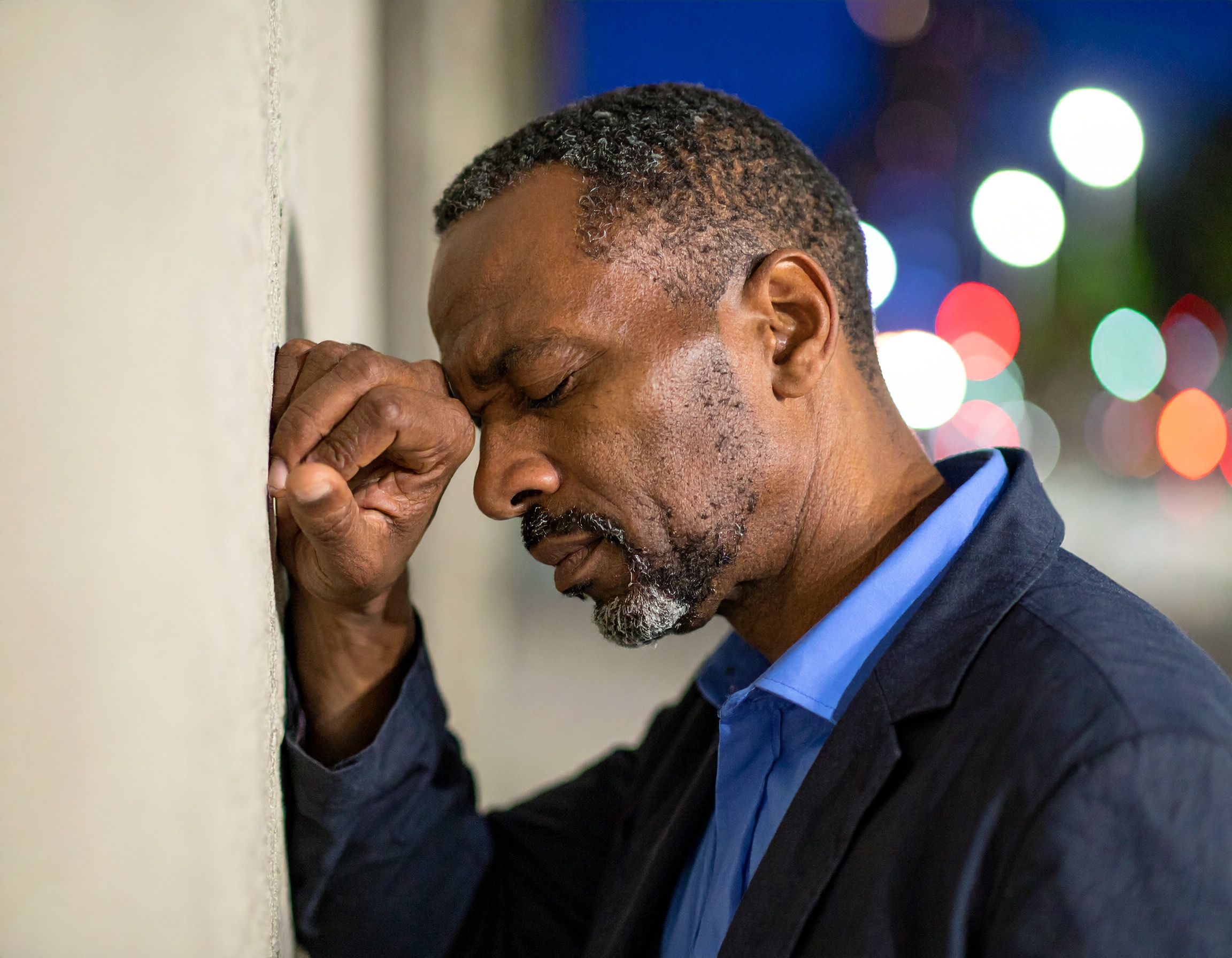 街の明かりがぼんやりとにじむ夜、壁に額を押し当てて目を閉じる男性の姿が、言葉にならない疲労や葛藤を物語る一枚。握られた拳と表情の緊張感が、心の内に渦巻く想いを静かに映し出しています。心の限界や挫折、思考の停止などを表現したい場面に適した感情ポートレートです。