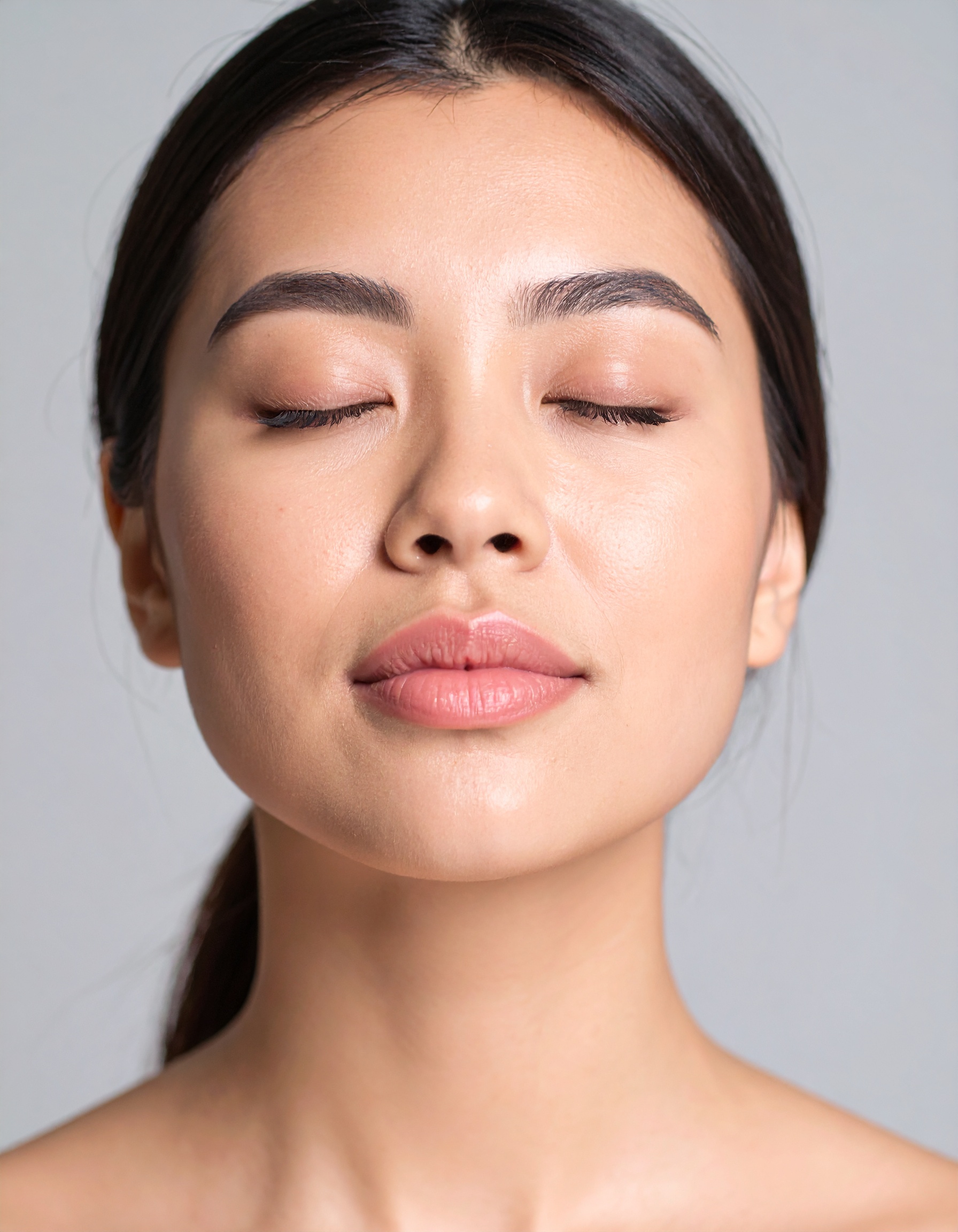 目を閉じて深く息を吐き出すような穏やかな表情の女性。緊張や雑念から解き放たれたような、静けさと心の整いを感じさせる印象です。内面の平穏をテーマにしたコンテンツに最適です。
