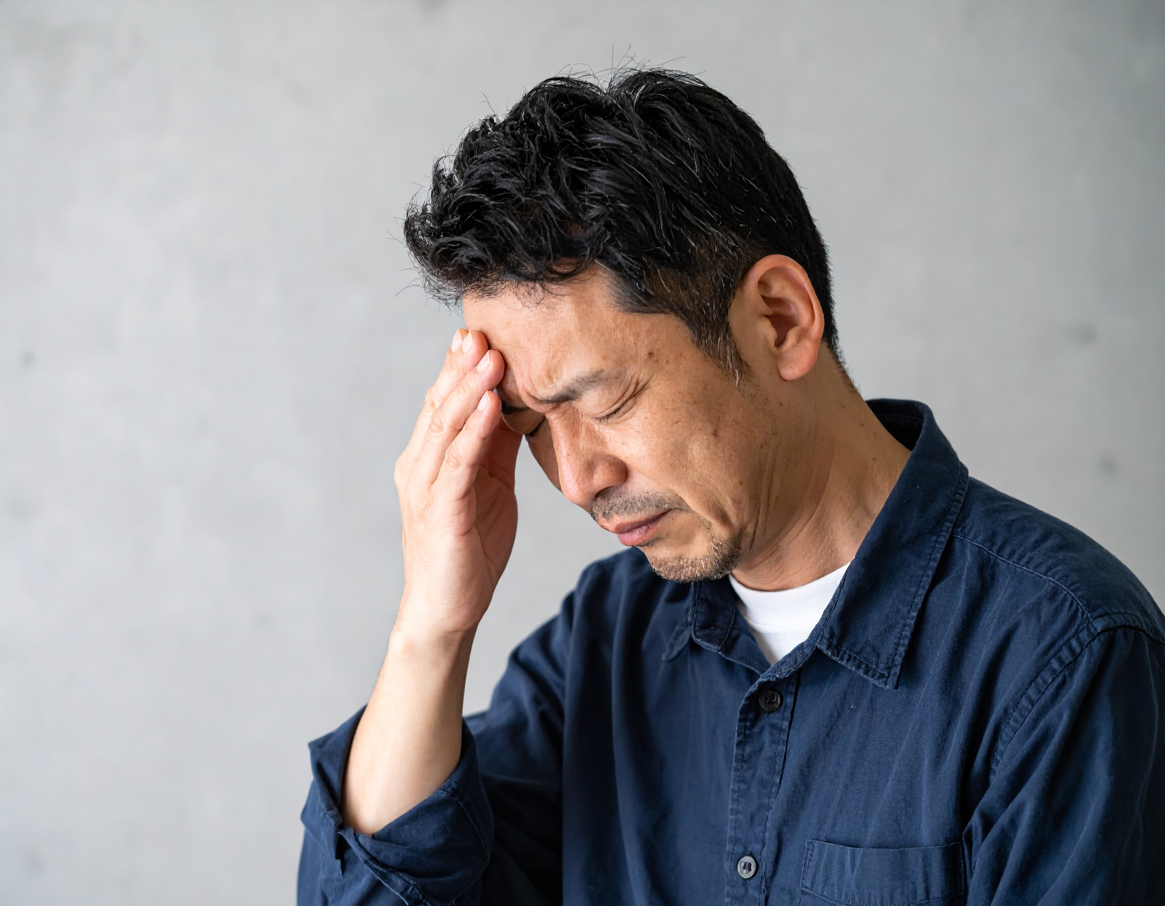 40代の日本人男性が、額に手を当てて目を閉じ、深く悩み苦しむ表情を見せている一枚。ストレス、頭痛、悩み、不安といったネガティブな感情を表す場面にぴったりの感情表現素材です。ビジネス、メンタルヘルス、医療・福祉系のコンテンツにも適しています。