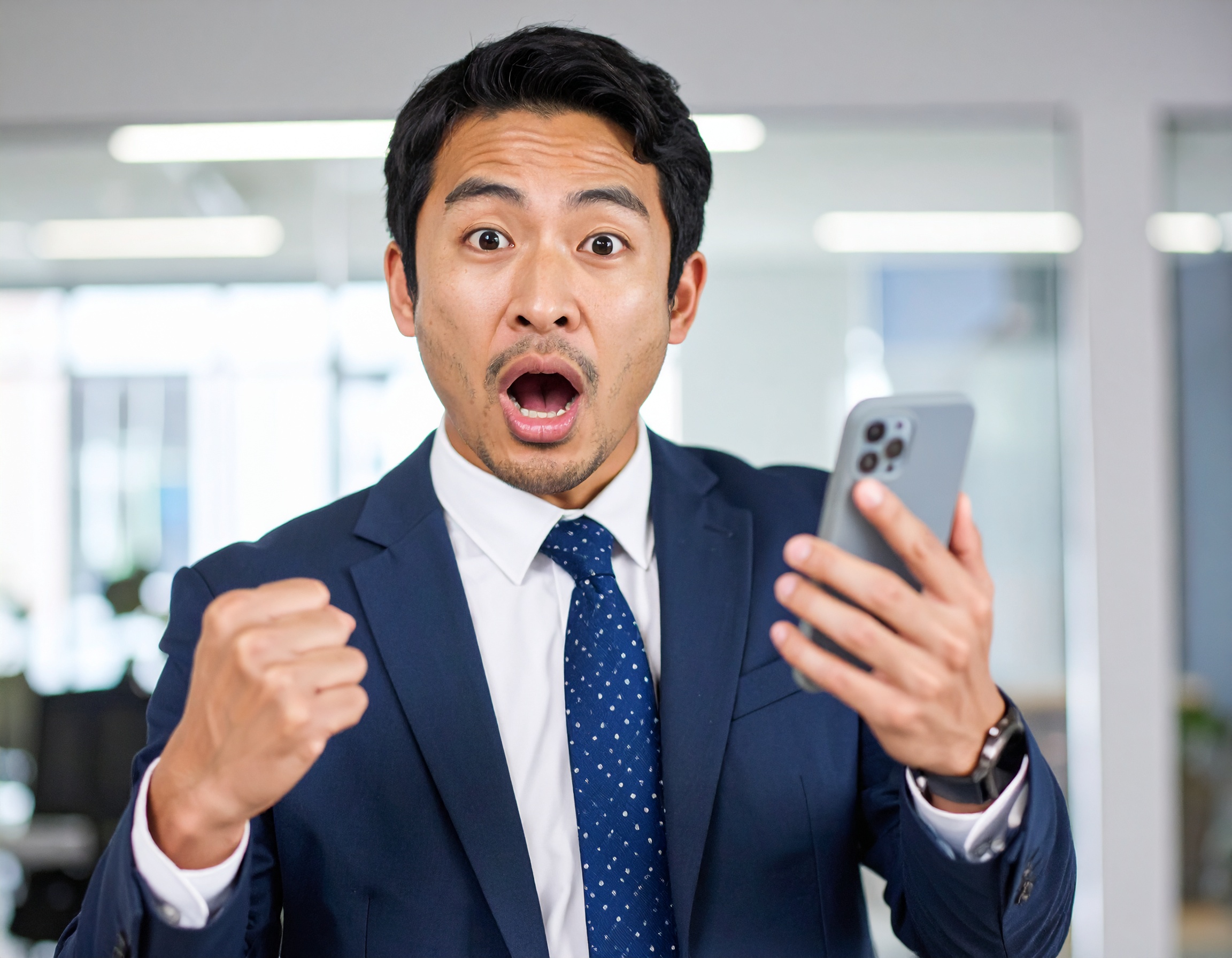 喜びスーツを着た日本人ビジネスマンが、スマートフォンを見ながら驚きと喜びの感情を表現している場面です。大きく目を見開き、片手を握りしめてガッツポーズをする姿から、良いニュースを受け取った瞬間の感情が伝わります。ビジネスシーンや成功・達成感を表す素材として利用しやすい一枚です。